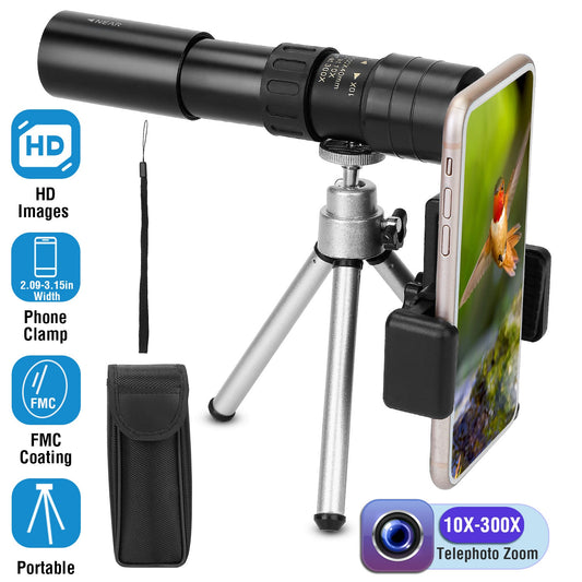 10X-300X Zoom Monocular Telescope High Definition Phone Telephoto Lens w/ Phone Holder Clamp Tripod For Hunting Hiking Sightseeing
