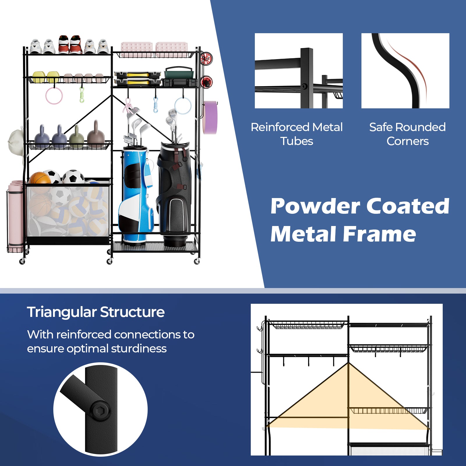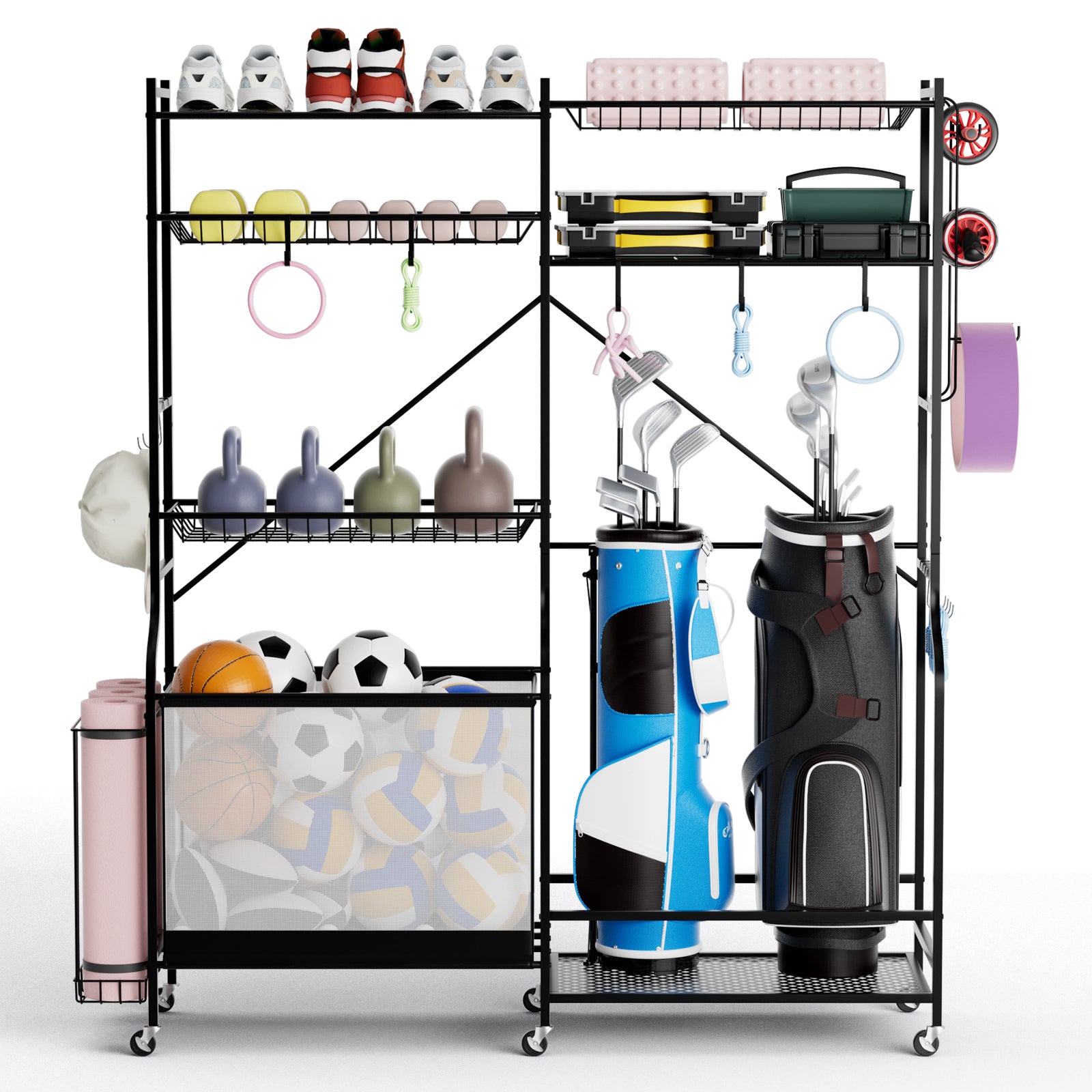 ● All-in-one storage solution for different balls golf bags dumbbells and yoga mats● Has a golf bag storage rack a ball storage basket shelves and a side yoga mat holder● Side storage hook and 13 removable hanging hooks provide more hanging storage● Features 5 adjustable shelves to ensure customized space arrangement● Sprayed metal frame consists of reinforced metal tubes for sturdiness and durability● Triangular structure with reinforced connections to ensure optimal sturdiness● Supported by 6 universal wheels which have a lockable design for convenience● Includes a dense mesh fabric basket that is tear-proof for a long-time use● Comes with the anti-falling baffles which can prevent items from falling off● Designed with safe rounded corners to further promote the using safety● Perfect assistant to help you organize sports equipment in the gym school or home Installation guide