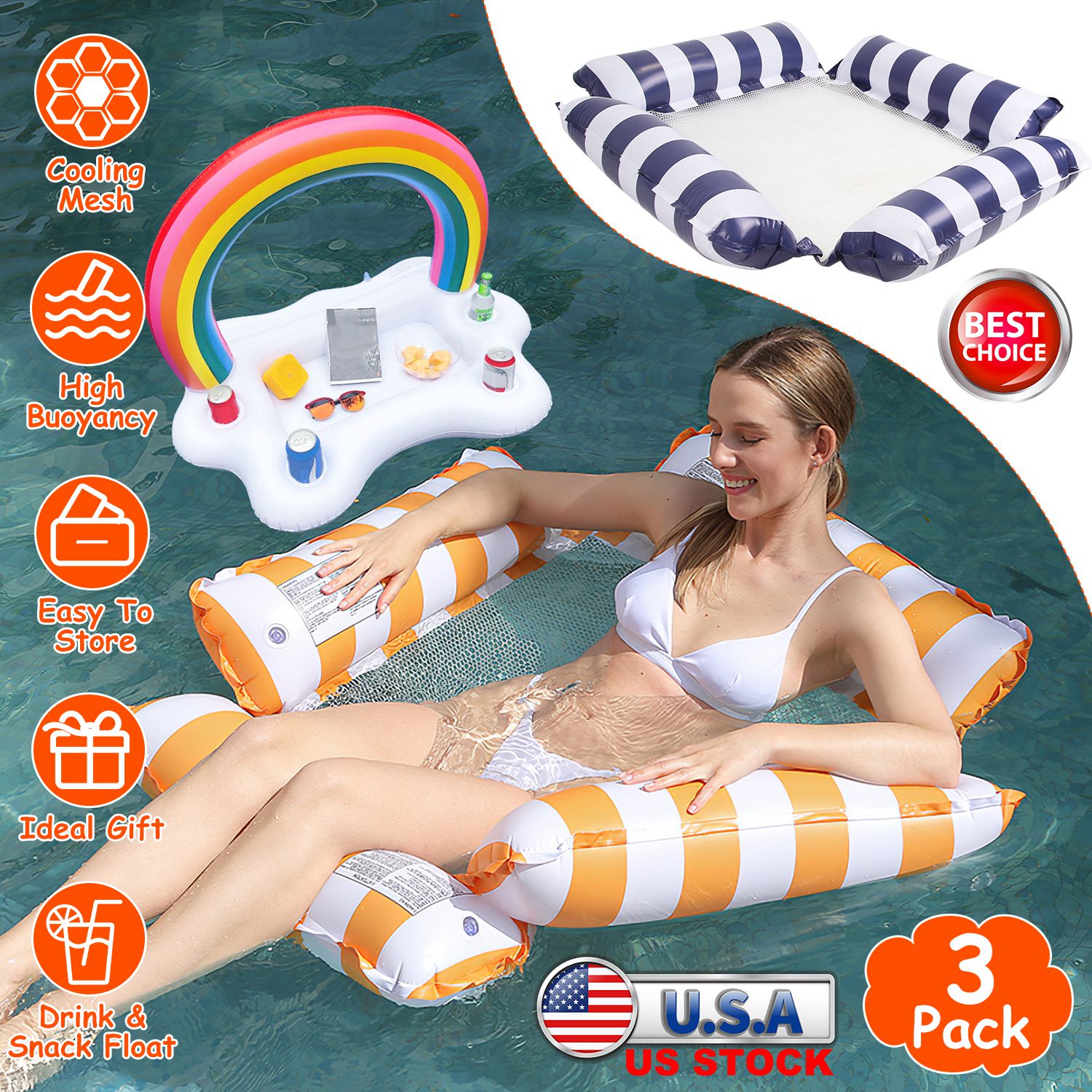 3 Pack Inflatable Pool Floats for Adult 1 Drink & Snack Float 2 Water Hammocks with High Buoyancy Pillows Cooling Mesh