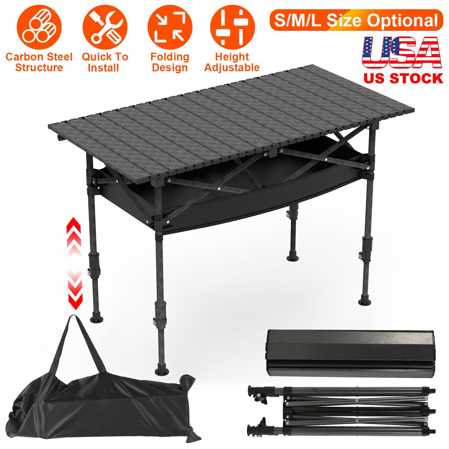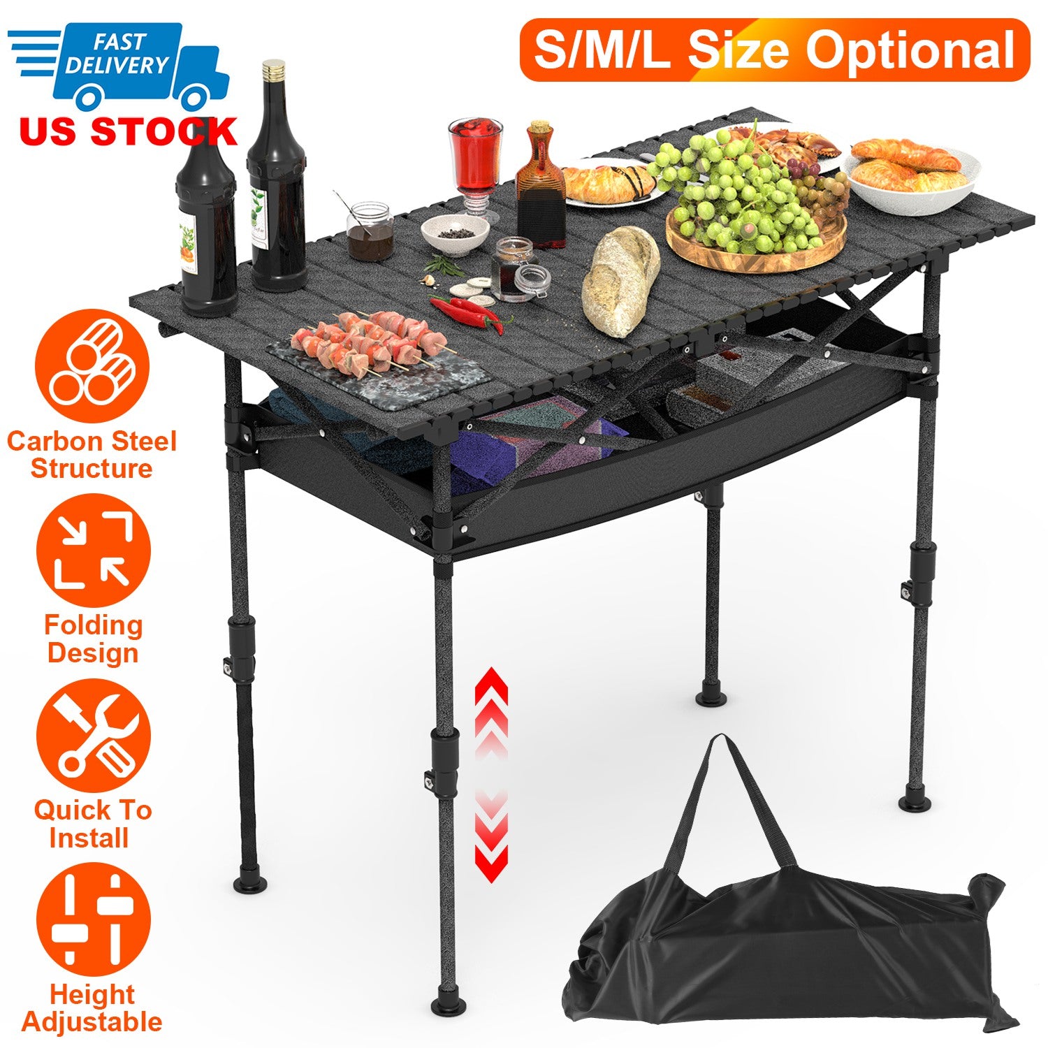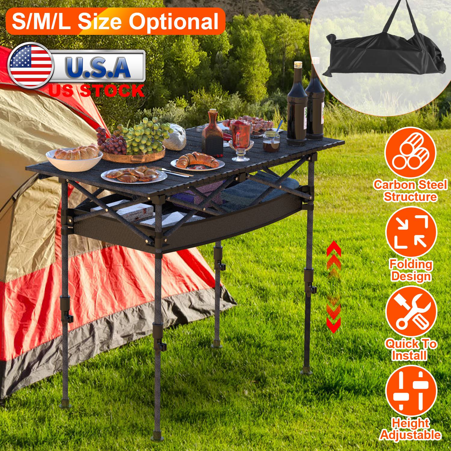 Portable Folding Camping Table With Adjustable Height Hanging Net Rustproof Carbon Steel Foldable Roll-Up Camping Table for Picnic Camping Hiking Beac