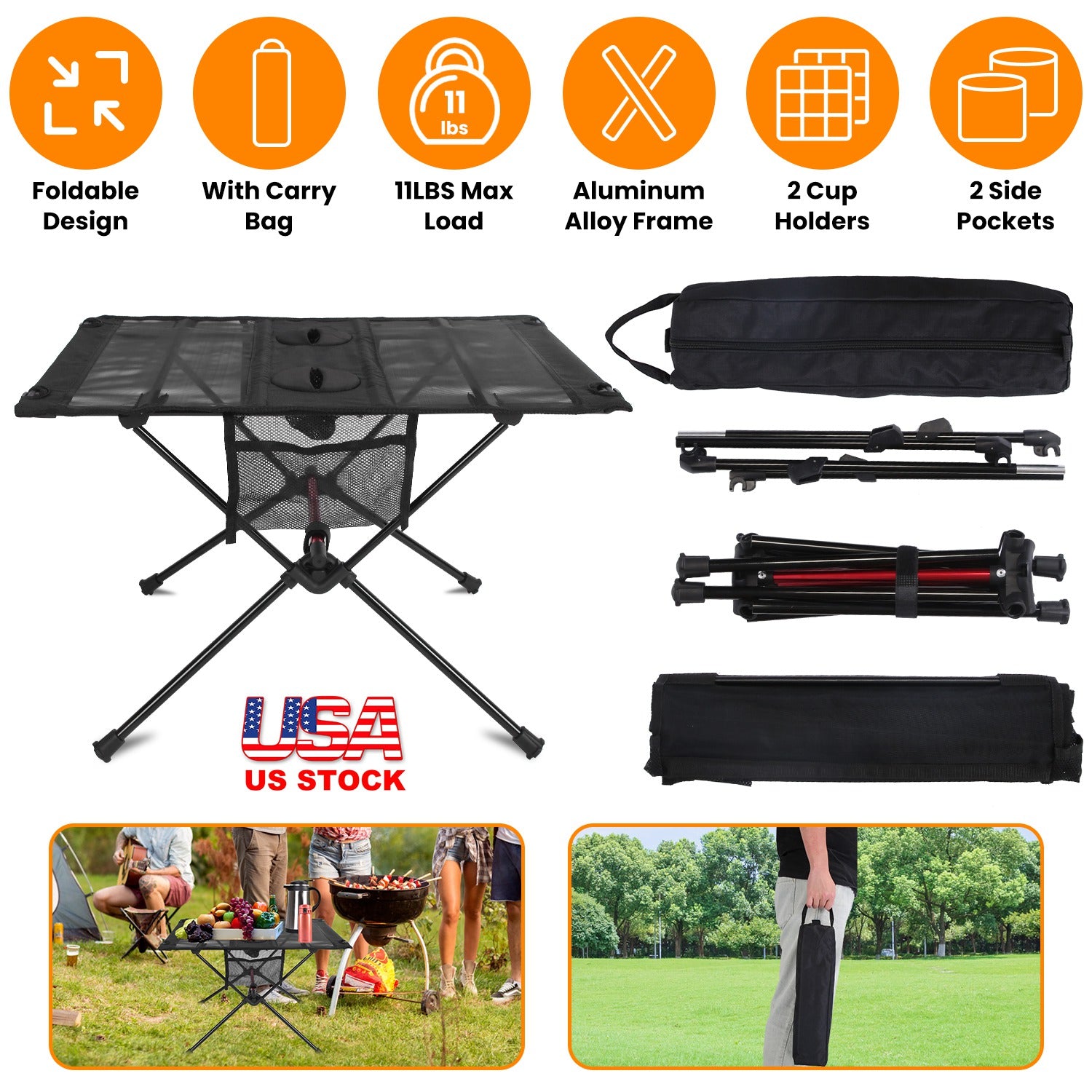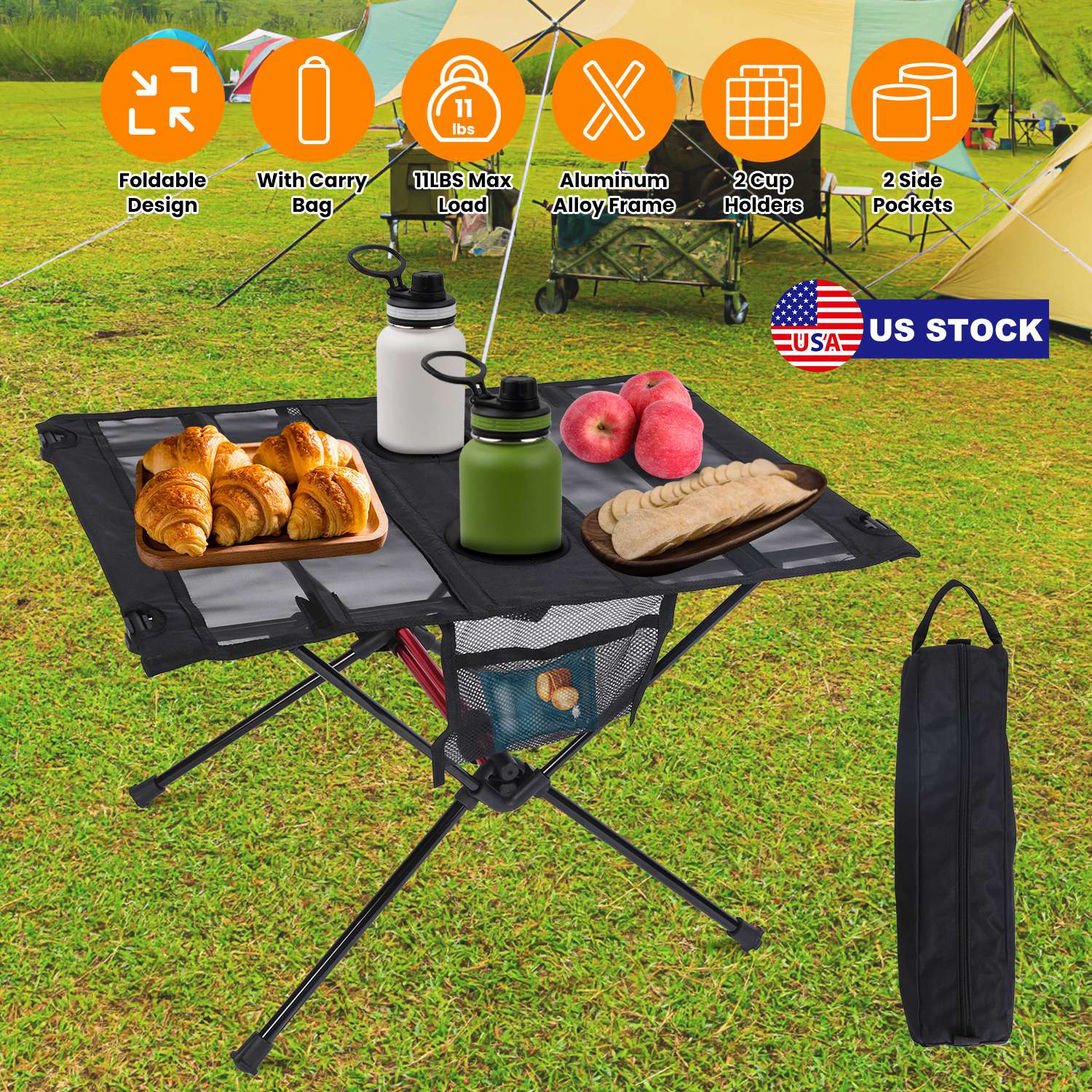 No matter you are a camper, a backpacker, or just out for a picnic, our lightweight portable folding table with a storage bag will be a good assistant to help place your foods, vegetables, fruits, water bottles and other items you need. The table top is made from scratch-resistant oxford fabric and tear-resistant nylon mesh, and the table frame is made of aluminum alloy with stable X-shape, which make it able to withstand up to 11lbs item. 2 Considerate cup holders and 2 side pockets are great to hold your beverage and snacks. A perfect partner for your outgoing activities.