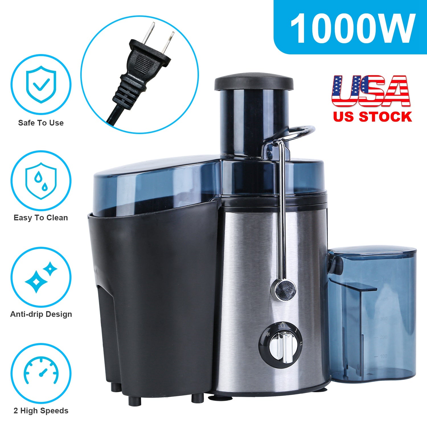With a 1000W powerful motor and stainless steel sharp blade, our centrifugal juicer efficiently extracts up to 26% more juice and 36% vitamins and minerals, which ensures a high juice yield. Features 3 modes for you to squeeze any vegetables and fruits. The 65mm/2.6in wide feed chute, 17Oz juicer cup and 54Oz pulp collector also provide much convenience when juicing. The locking arm, transparent cover and anti-slip base ensure much safety and stability. Quick to assemble and disassemble within minutes, easy to clean.