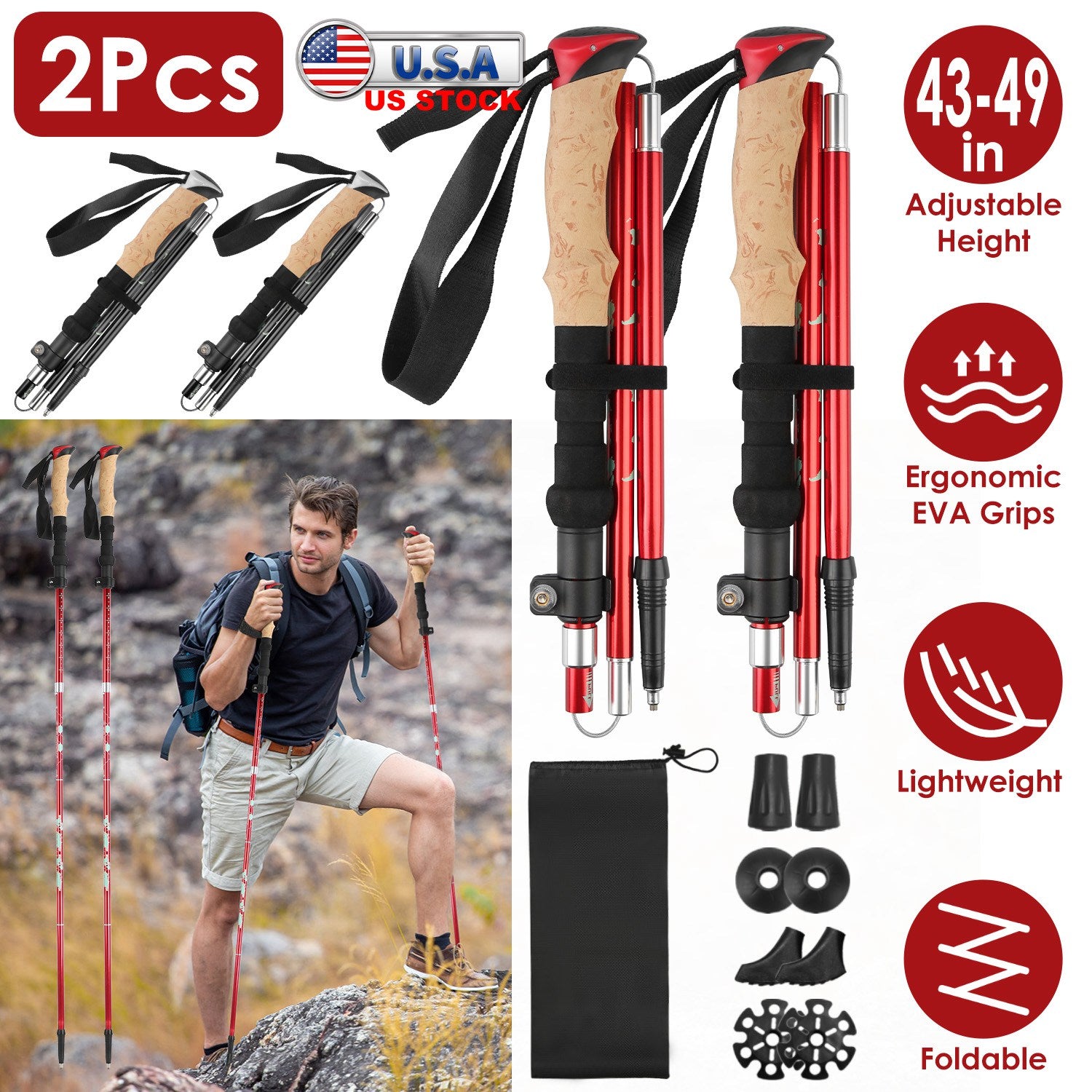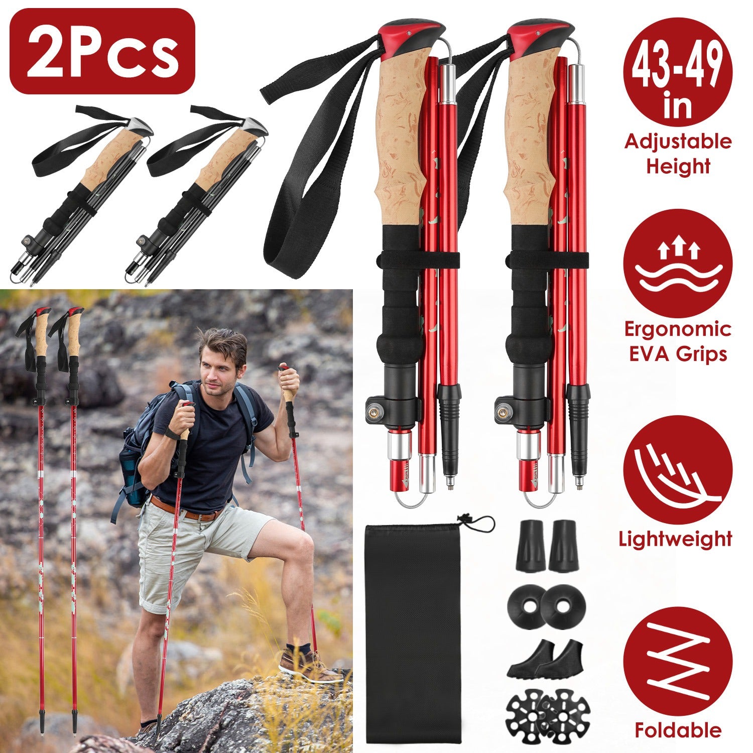 If you are a hiking enthusiast, these 2Pcs lightweight trekking poles with 2 x Rubber Tips, 2 x Mud Stops, 2 x Walking Caps and 2 x Snow Baskets, are must-have partner during your outdoor activities to tackle every adventure as a breeze. The foldable and lightweight design and the storage bag allow it to be carried outside more conveniently. 43-49in Adjustable height is suitable for women, men and the seniors. Made of aluminum alloy and tungsten-manganese steel, it’s strong enough for unparalleled stability and support. Sweat-absorbent, non-slip EVA foam grips with ergonomic shape ensure comfortable stability and easy travel of a variety of terrain. Suitable for explorers of all ages and skill levels.