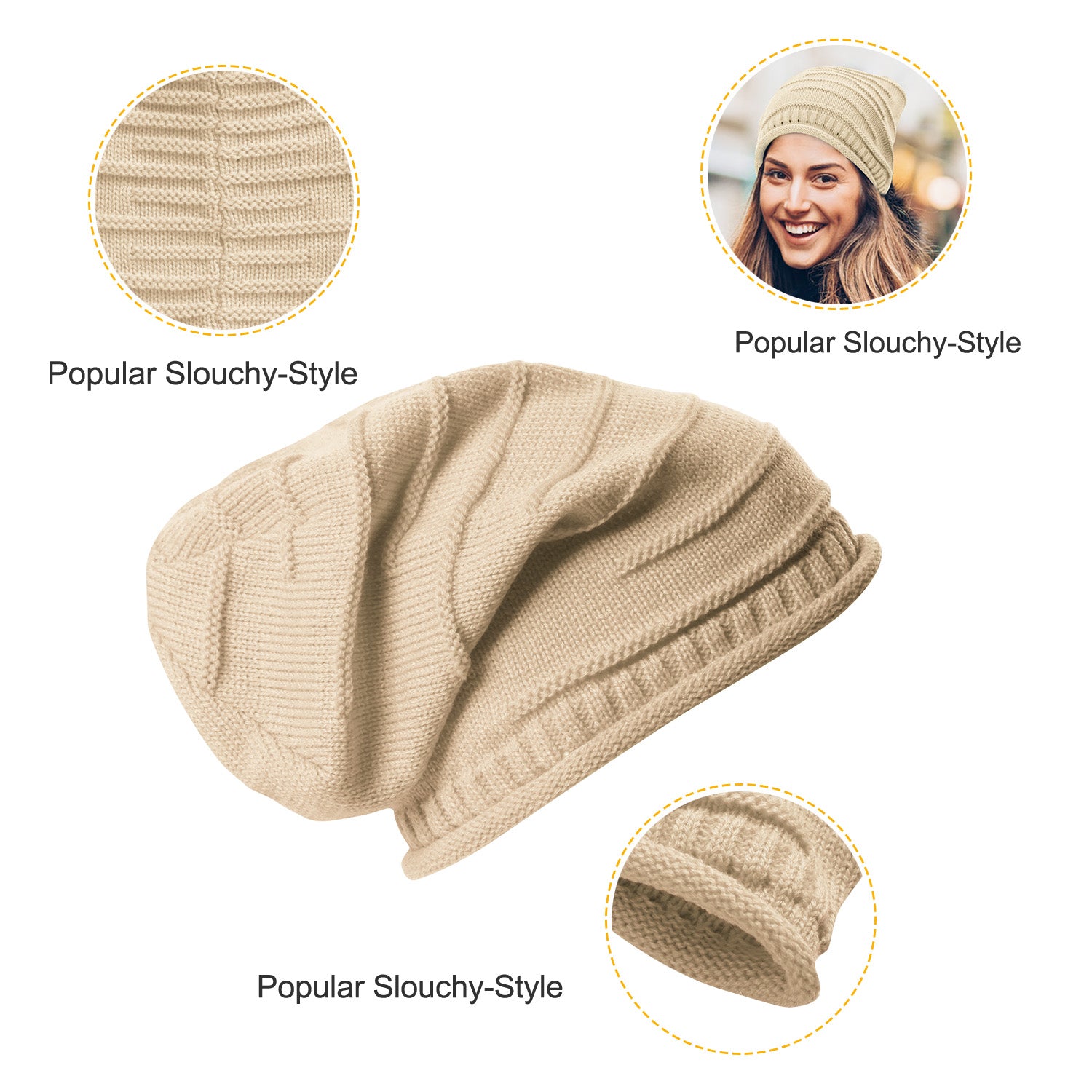 Adopting premium quality stretchy, soft-spun acrylic fiber and high-grade knitting process for extra warm, our beanie hat is soft, stretchable, breathable and moisture-wicking, lightweight and wearing comfortable. Adopting the popular slouchy-style elements, curly brim and multiple linear knitting textures, it is stylish and can decorate your face and match your various clothes. It can be worn in winter, spring, autumn and summer.