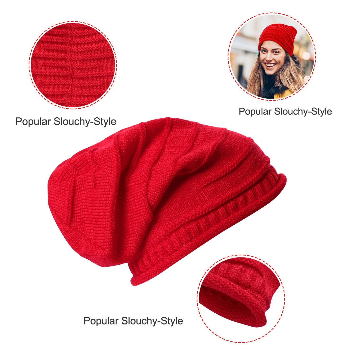 Adopting premium quality stretchy, soft-spun acrylic fiber and high-grade knitting process for extra warm, our beanie hat is soft, stretchable, breathable and moisture-wicking, lightweight and wearing comfortable. Adopting the popular slouchy-style elements, curly brim and multiple linear knitting textures, it is stylish and can decorate your face and match your various clothes. It can be worn in winter, spring, autumn and summer.