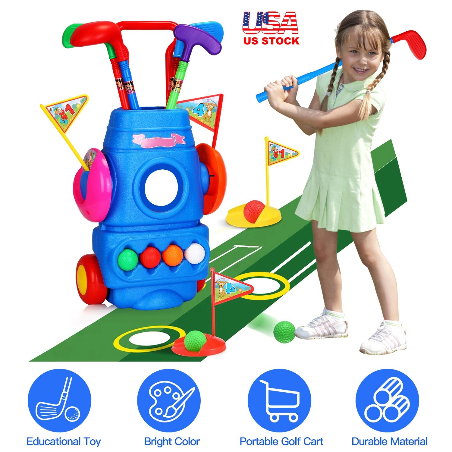 Toddler Golf Set with 4 Balls 4 Clubs 2 Holes 2 Flags Golf Cart Indoor Outdoor Golf Game Gift For 3-5 Years Old Kids
