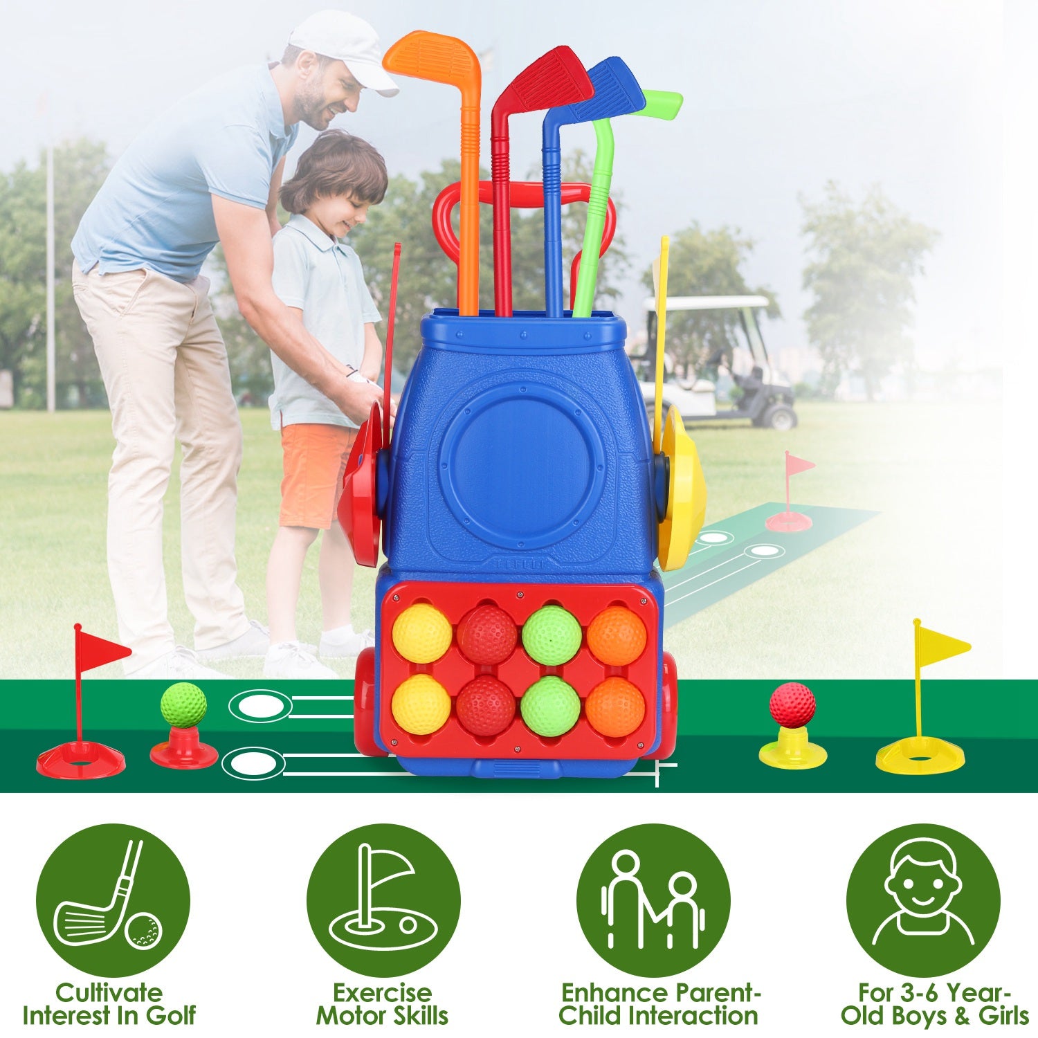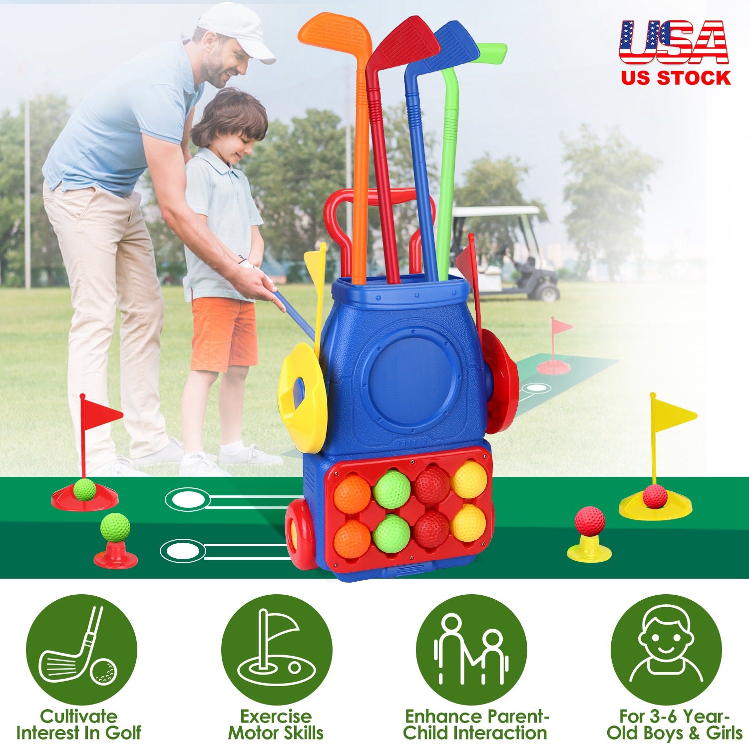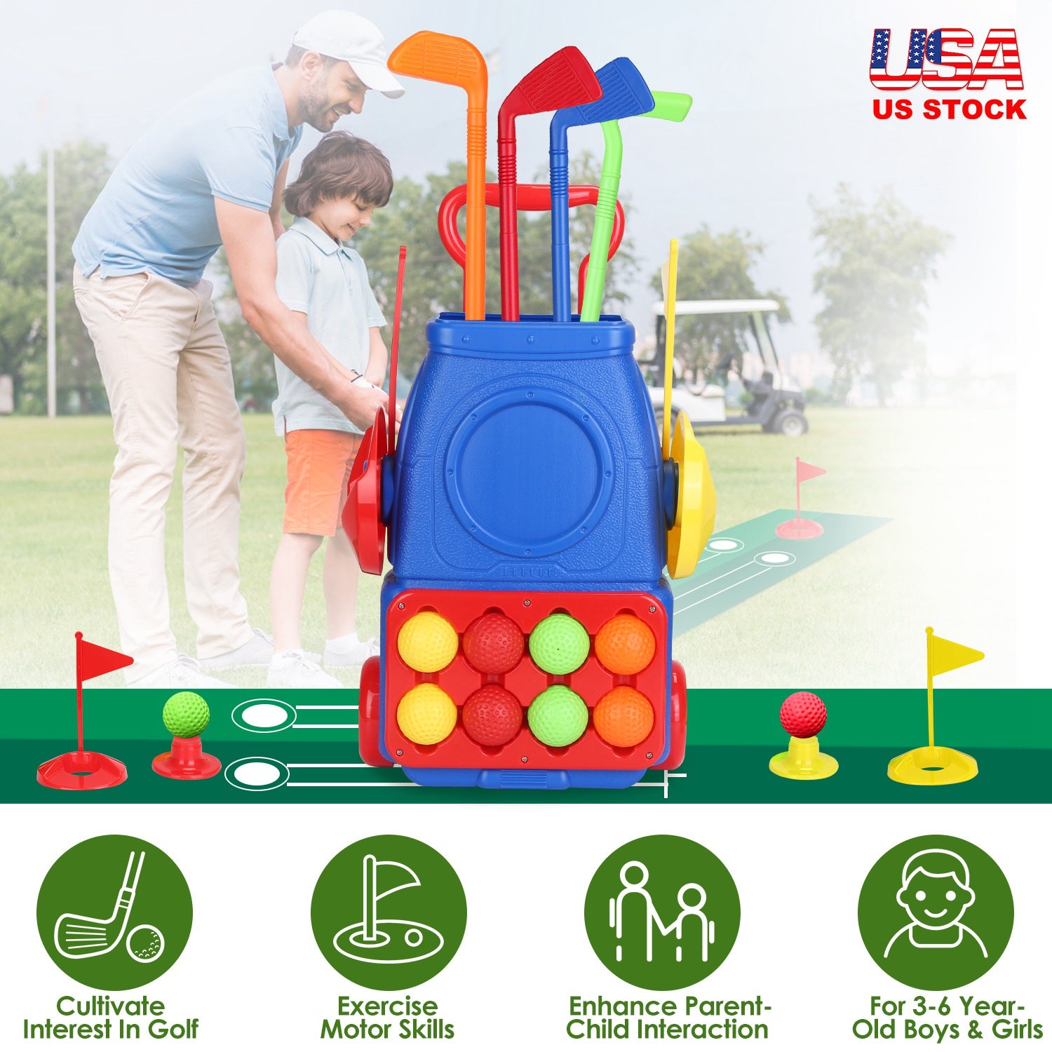 Our complete golf set including 4 golf clubs with 4 vivid colors, 8 colorful golf balls, 2 golf tees, 2 golf holes, 2 flags, 1 golf mat, stickers, 2 wheels covers, and 1 golf cart, is a must-have partner in your kids\' childhood. It\'s able to improve kids\' interest in golf sports, cultivate their motor coordination, spatial imagination and analytical skills. Helpful for their own physical development and social skills. Ideal gift for 3-6 year-old boys and girls in their birthday, Easter, Christmas, Halloween, Thanksgiving, New Year\'s Day, and other special holidays. They will love it!
