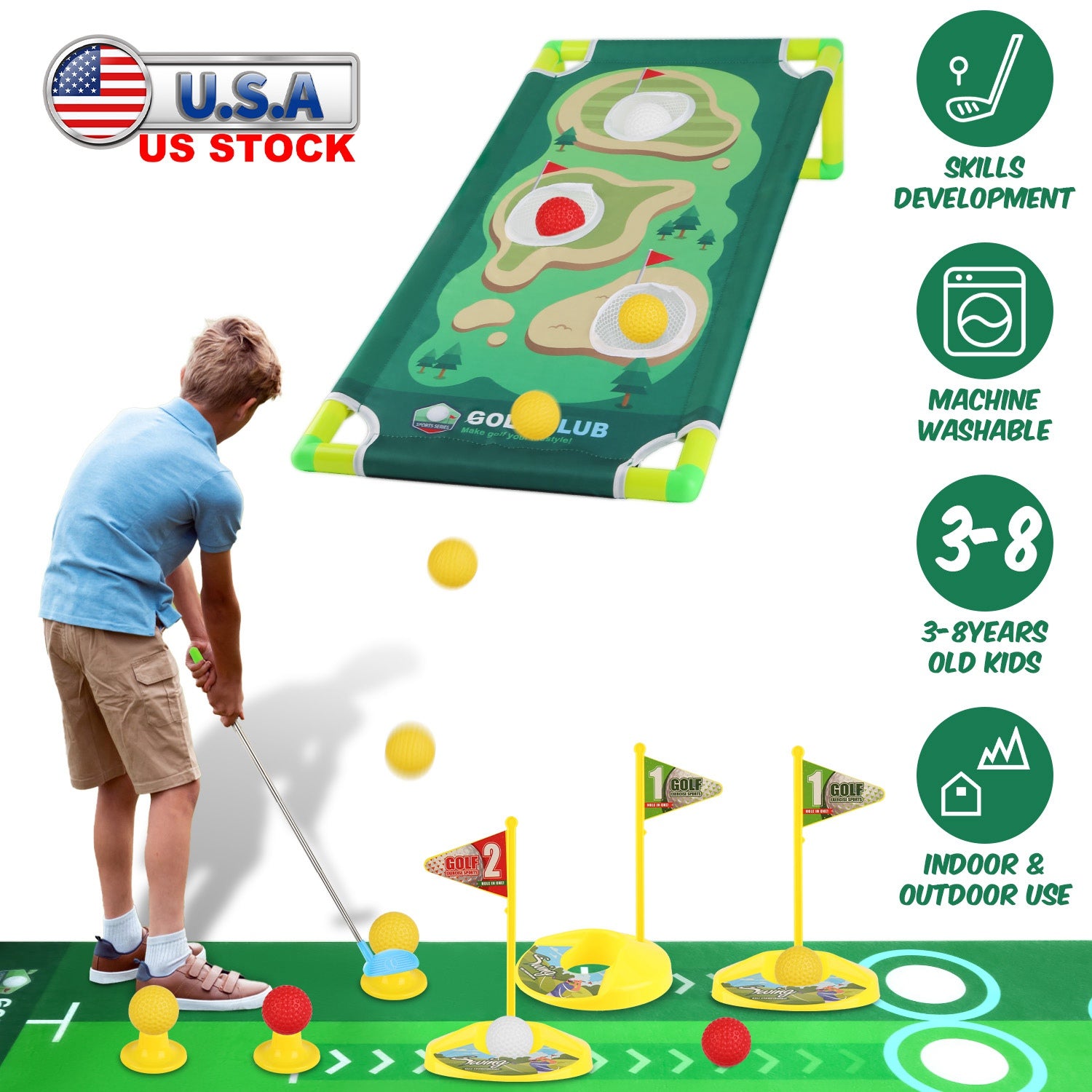 This toddler golf club toy set includes a golf cornhole board, putting mat, 9 multi-color golf balls, 3 golf tees, 3 target bases, 3 flags, and 3 retractable golf clubs, which is designed to introduce kids to the game of golf in a fun and engaging way. The set offers an alternative to screen time and sedentary behavior, suitable for indoor and outdoor use. Beneficial for promoting parent-child interaction and can improve kids\' interest in sports while contributing to their physical and cognitive development.