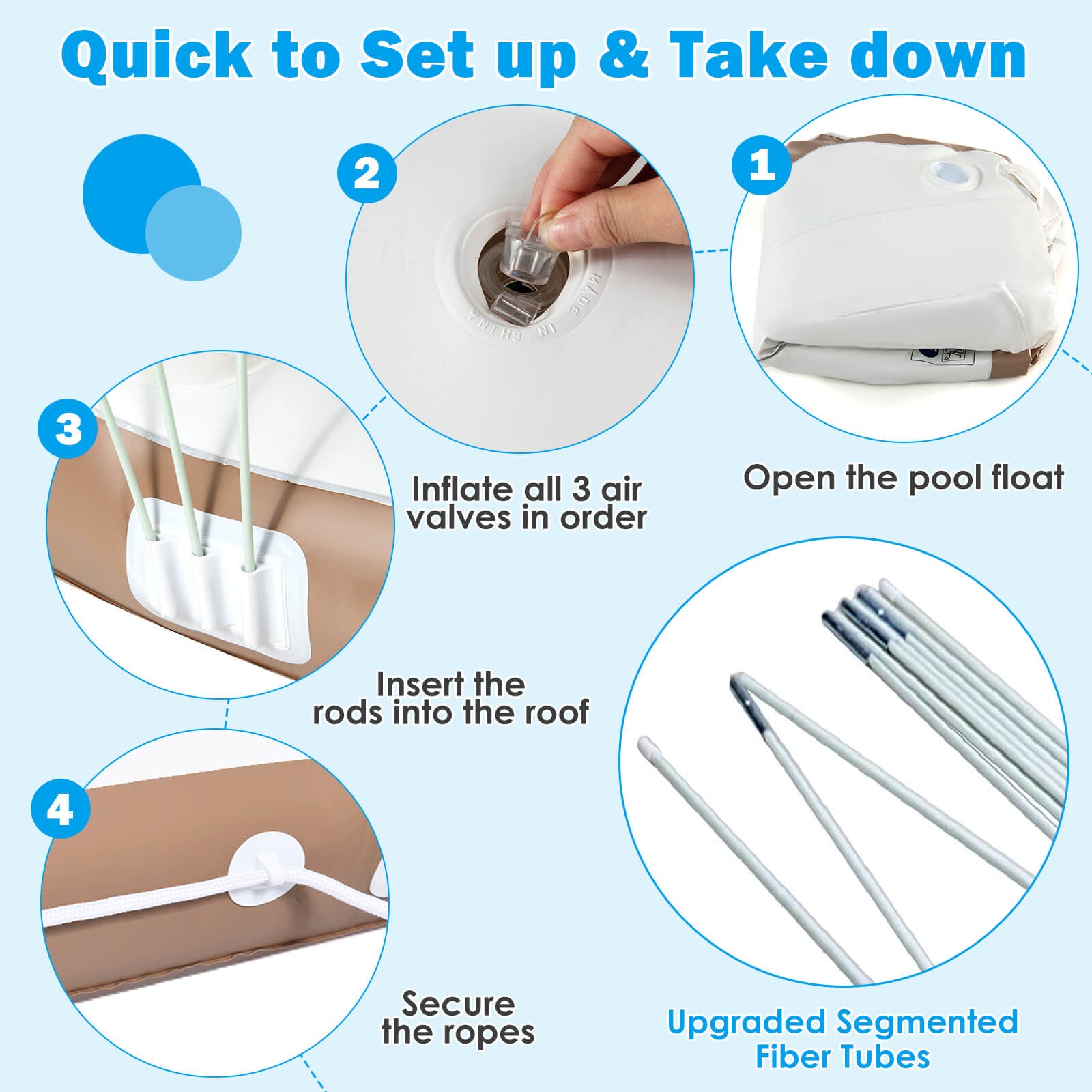 ● Comes with a detachable sunshade to meet your different needs● With 2 cup holders set at armrests for easily getting favorite drinks● Equipped with 3 air values allowing for easy blow-up and blow-off● The canopy is made of silver-coated fabric with great sun protection● Foldable and compact design allows for easy transportation and storage● Made of premium PVC materials odorless durable waterproof eco-friendly● Comes with armrests and backrests that accords with human body engineering