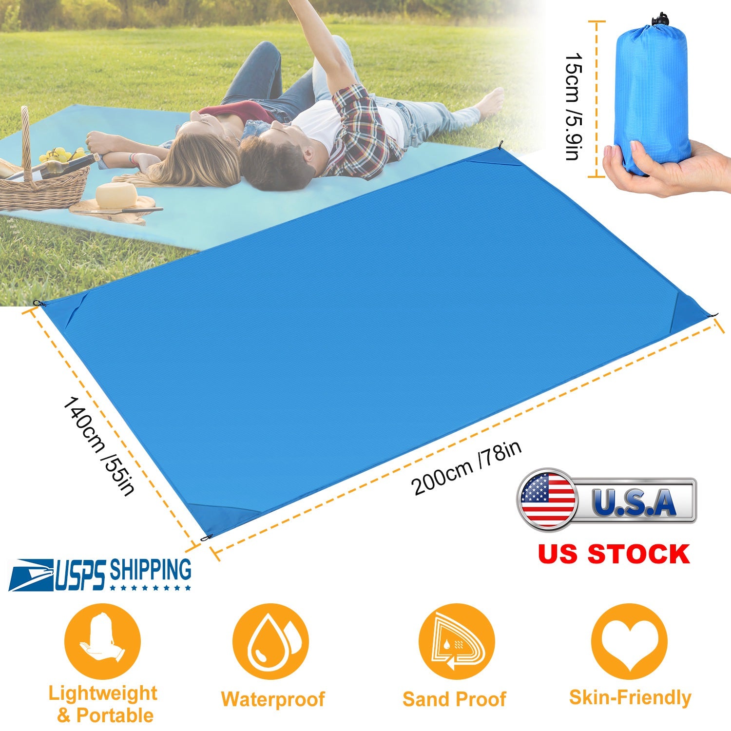 Our beach blanket extends to 4.6ft x 6.6ft, large enough to comfortably seat up to 6 adults and fold into a compact size of 5.9" x 3.9" x 1.8" for easy storage. Made of quality 210T Polyester which is strong, durable, lightweight and waterproof; NO WORRY about the sand sticking to the beach blanket and easy to get off the sand and brush off. Designed with 4 incorporated pockets and 4 stake loops to provide dual windproof protection. Perfect for picnic, camping, outing and beach travelling.