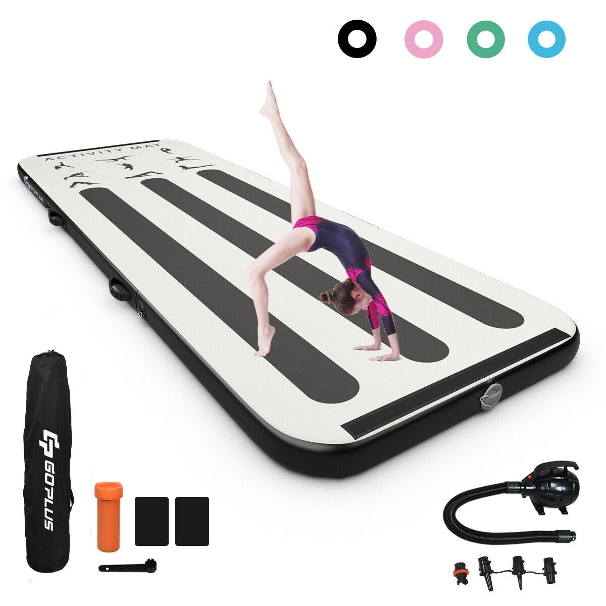 The inflatable gymnastic mat for air runway is made of high-quality PVC material which is safe and convenient to carry and store so it will be your best choice for fitness at home! Do you want to do the various activities in your home or backyard without getting out to the gym paying great fees? This inflatable gymnastic mat will be the best choice!Thanks to its premium PVC material it is safe to jump and land on freely. There's no need to worry about the accidental broken off the mat as an air pump and a repairing kit are provided for your convenience. As it can be folded easily it is convenient for you to carry and store easily. This inflatable gymnastic mat is great for gymnastics tumbling cheerleading free running stunting martial arts and water yoga! Don't hesitate to buy it! Two-layer thick PVC material is waterproof non-slip durable and not easy to be torn Drop stitch fabric provides high intense and superior elasticity Hook and loop fasteners and D-rings help connect two or more mats together for different needs Waterproof material makes it easy to clean and can be used on the water Good sealing performance to ensure long service time once inflated Powerful electric pump with high pressure to help inflate the mat quickly Fast deflation and compact folding design easy to be stored at the corner to save space Handles and carrying bag convenient for transportation when going out A repairing kit included for more convenience Perfect for gymnastics tumbling free running stunting martial arts water yoga etc