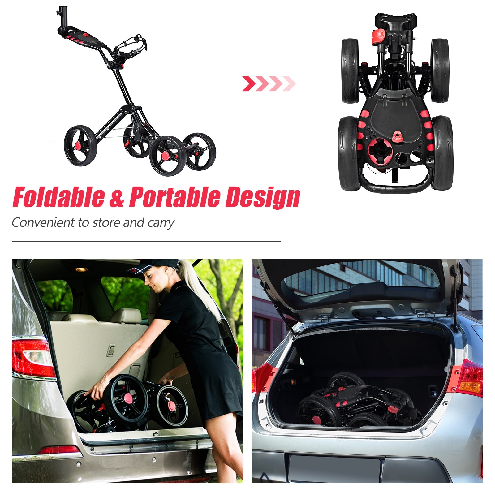 This is the 4 wheel golf push cart whch can be folded to compact size for easy storage before or after your round of golf. The 10.5" rear and 9.5" front wheels make it roll easily in the high grass. Golfers can push the cart effortlessly on all terrain with the stable 4 wheel design multiple handle positions and smooth-rolling ball-bearing wheels. The cart is equipped with features that most golfers want including umbrella holder scorecard holder with storage compartment and beverage holder on the handle. If you're looking for a golf push cart don't hesitate to choose this one! Strong aluminum frame weighs less than 15 lbs Adjustable push handle to accommodate different hand positions Umbrella holder included scorecard holder integrated with storage compartment beverage holder All terrain 10.5" rear wheels for smooth gliding and foot brake Easy clip bag straps Easy fold for storage Simple assembly is required according to included instruction