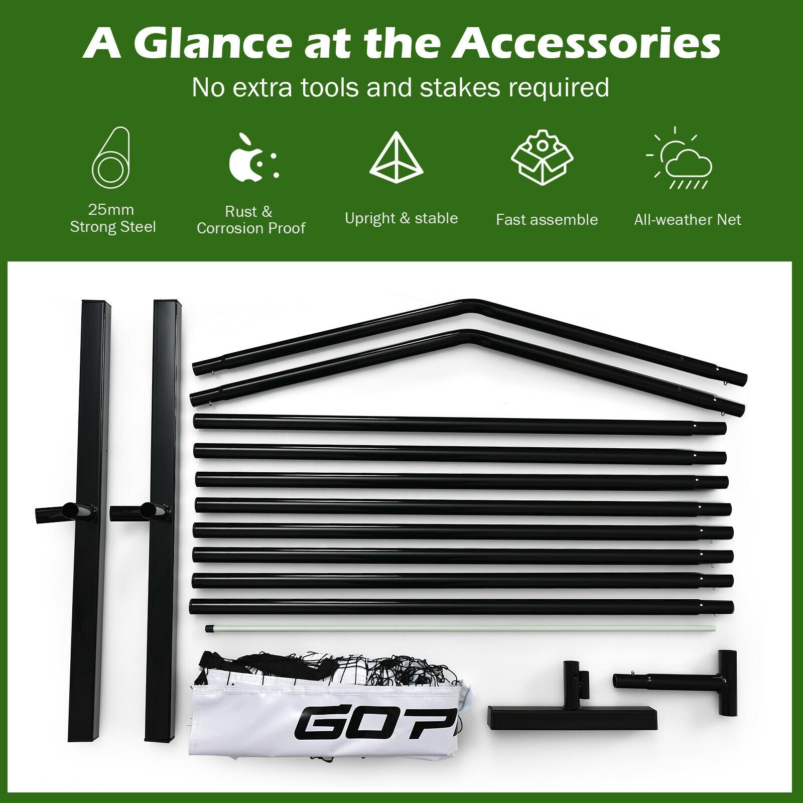 ● A great pickleball gear for both beginners and advanced players● Dimension of 22' x 28'' x 36'' (L x W x H) fit into the regular pickleball size protocol● Exceptional quality is ensured by the strong 25 mm steel frame and resilient polyester nettings● High-quality middle fiberglass post to upright the netting● A 600D Oxford carrying bag is included for portability and space-saving storage● Assembly does not require any tool simply interlock and insert each part● Loop and hook fasteners for the net to attach the frame firmly● Reducing screen time and having a healthy and quality time with family and friends
