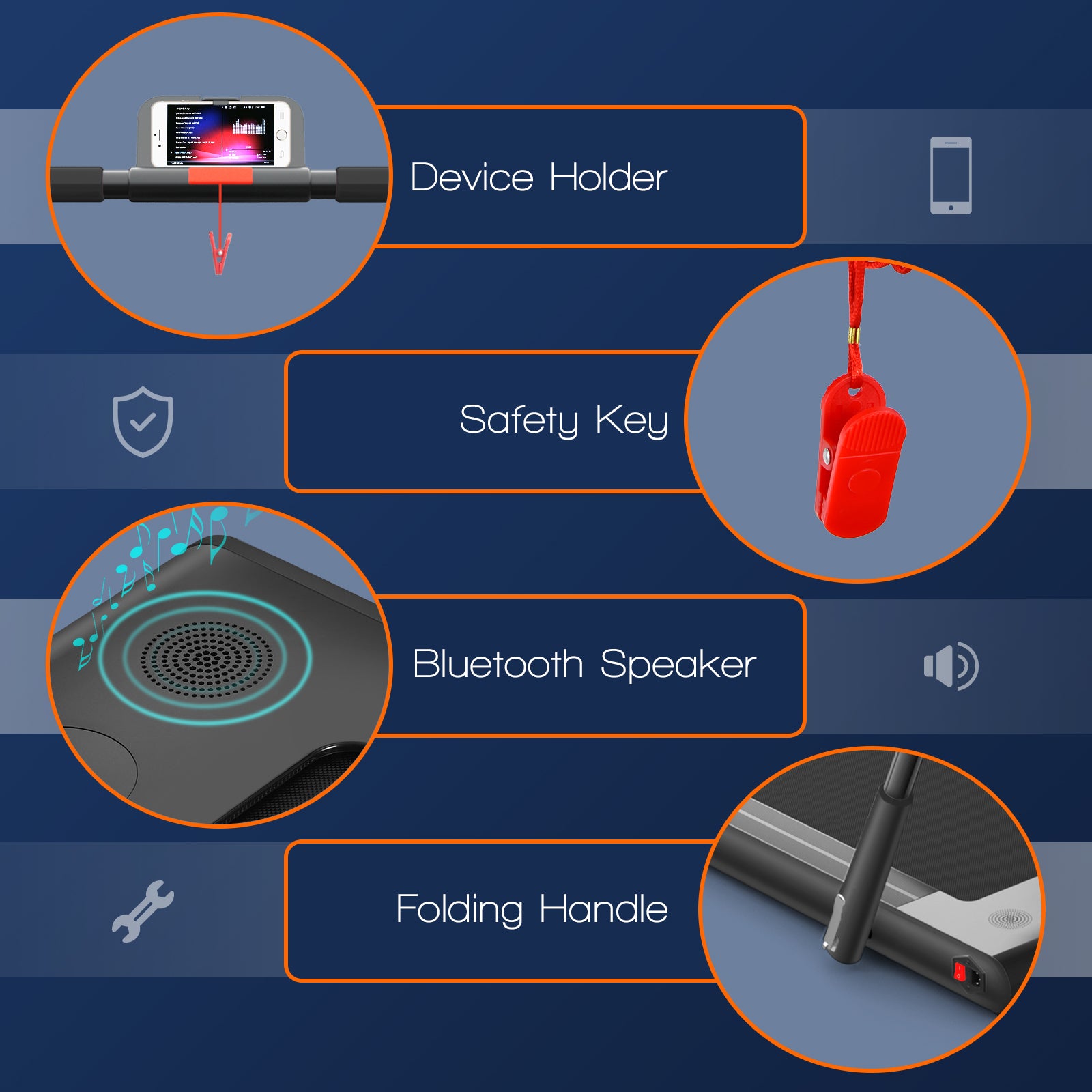 ● Including 1 Folding Treadmill 1 Remote Control(Need 1xCR2032 button battery not included) 1 Phone Holder 1 Safety Key 1 Power Cord 1 Instruction● Useable as an under-desk treadmill and a running treadmill● Walking mode offers a speed of 0.6 to 2.5 mph (1-4km/h) while speeds up to 7.5mph (1-12km/h) is offered in the running mode● The powerful 2.25 hp quiet motor makes your workout quieter and more comfortable● Multi-layer shield design and sturdy steel frame offer it a great shock-absorbing capability and therefore reduces noise significantly● 5-layer non-slip running belt provides an effective and safe cushion to your knees and muscles● LED display for time speed distance and calories display while monitoring your movement data in real-time● The remote control adjusts your movement speed and stops instantly● Phone holder effective to watch videos or chat with friends while running● The safety key ensures an emergency stop● Built-in transport wheels make it easy to move and store● The compact and foldable design saves space and is ideal for home and office use● No installation required and useable straight out of the box● Features a power-saving mode to save energy● Certified with CE ROHS CB EN957 IEC by SGS● Speed unit could be switched between mile and km in APP● Please do not place the treadmill on carpet during usage to avoid motor overheatNote: The running is used for a period of time it must be lubricated with special methy silicone oil.