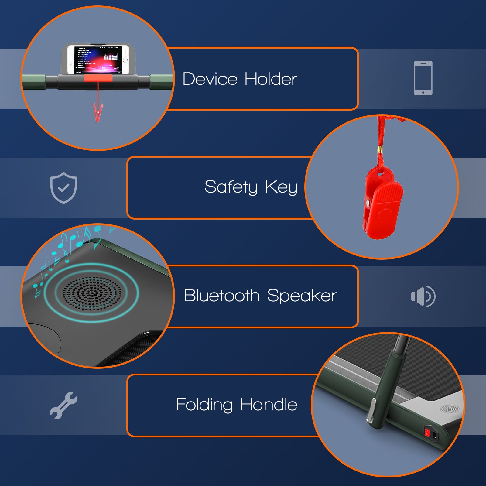 ● Including 1 Folding Treadmill 1 Remote Control(Need 1xCR2032 button battery not included) 1 Phone Holder 1 Safety Key 1 Power Cord 1 Instruction● Useable as an under-desk treadmill and a running treadmill● Walking mode offers a speed of 0.6 to 2.5 mph (1-4km/h) while speeds up to 7.5mph (1-12km/h) is offered in the running mode● The powerful 2.25 hp quiet motor makes your workout quieter and more comfortable● Multi-layer shield design and sturdy steel frame offer it a great shock-absorbing capability and therefore reduces noise significantly● 5-layer non-slip running belt provides an effective and safe cushion to your knees and muscles● LED display for time speed distance and calories display while monitoring your movement data in real-time● The remote control adjusts your movement speed and stops instantly● Phone holder effective to watch videos or chat with friends while running● The safety key ensures an emergency stop● Built-in transport wheels make it easy to move and store● The compact and foldable design saves space and is ideal for home and office use● No installation required and useable straight out of the box● Features a power-saving mode to save energy● Certified with CE ROHS CB EN957 IEC by SGS● Speed unit could be switched between mile and km in APP● Please do not place the treadmill on carpet during usage to avoid motor overheatNote: The running is used for a period of time it must be lubricated with special methy silicone oil.