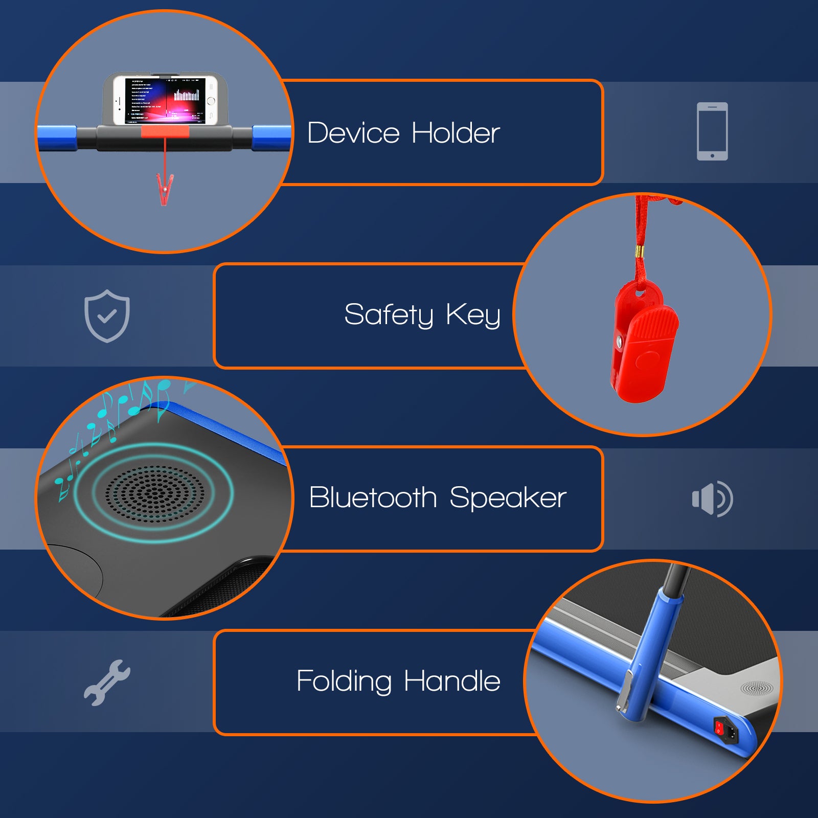 ● Including 1 Folding Treadmill 1 Remote Control(Need 1xCR2032 button battery not included) 1 Phone Holder 1 Safety Key 1 Power Cord 1 Instruction● Useable as an under-desk treadmill and a running treadmill● Walking mode offers a speed of 0.6 to 2.5 mph (1-4km/h) while speeds up to 7.5mph (1-12km/h) is offered in the running mode● The powerful 2.25 hp quiet motor makes your workout quieter and more comfortable● Multi-layer shield design and sturdy steel frame offer it a great shock-absorbing capability and therefore reduces noise significantly● 5-layer non-slip running belt provides an effective and safe cushion to your knees and muscles● LED display for time speed distance and calories display while monitoring your movement data in real-time● The remote control adjusts your movement speed and stops instantly● Phone holder effective to watch videos or chat with friends while running● The safety key ensures an emergency stop● Built-in transport wheels make it easy to move and store● The compact and foldable design saves space and is ideal for home and office use● No installation required and useable straight out of the box● Features a power-saving mode to save energy● Certified with CE ROHS CB EN957 IEC by SGS● Speed unit could be switched between mile and km in APP● Please do not place the treadmill on carpet during usage to avoid motor overheatNote: The running is used for a period of time it must be lubricated with special methy silicone oil.