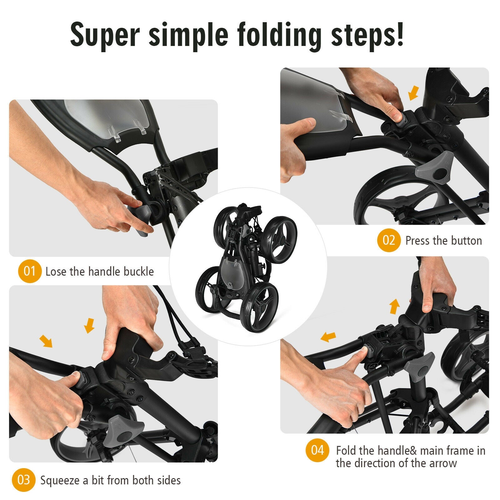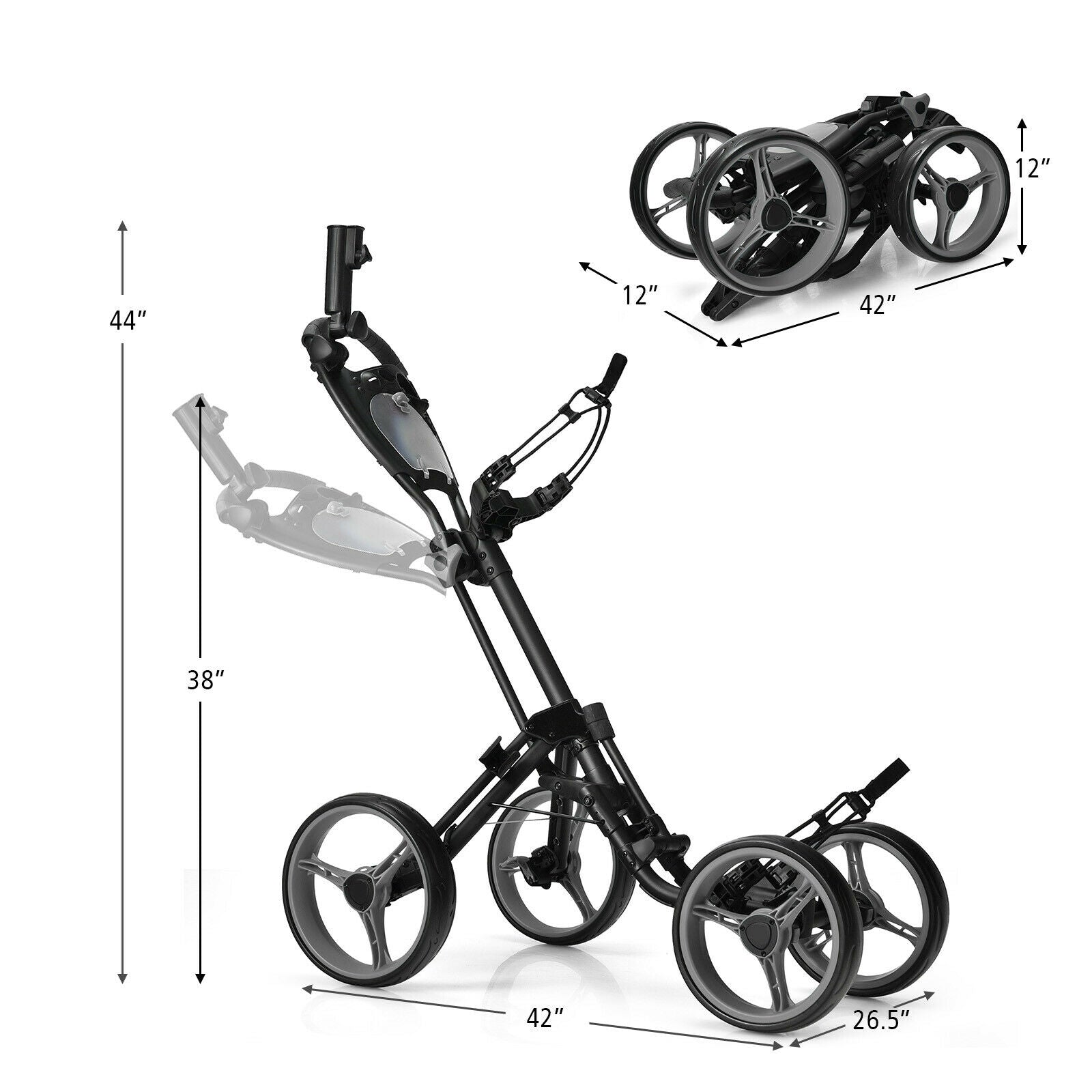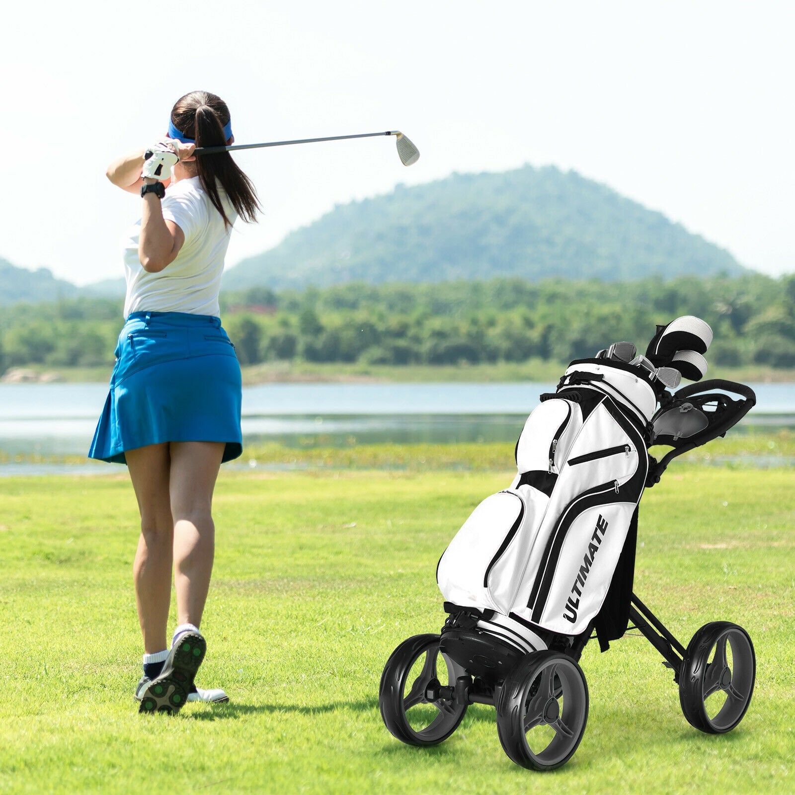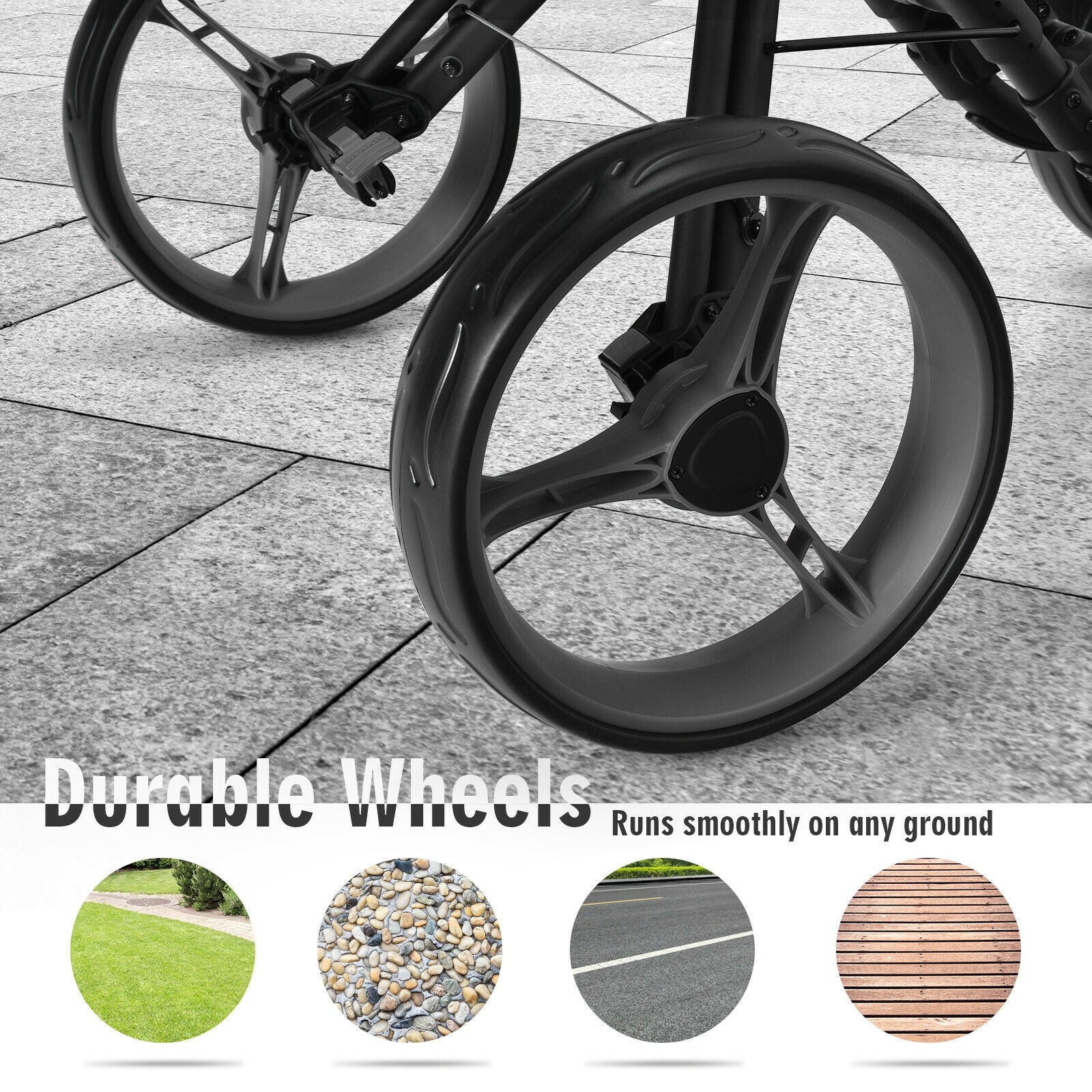 ● Sturdy aluminum construction with a high load-bearing capacity● Wear-resistant EVA wheels with shock absorption● Upper & lower brackets w/ elastic strap could fix any size of golf bag● Big φ11.4” rear and φ10.4” front wheels with anti-slip texture● Adjustable handles suit different heights of different people● The quick brake mechanism make it stop firmly without sliding● Foldable design makes it very easy to store and carry● Adjustable umbrella holder always keep users from harmful rays● A waterproof storage bag holds all your items safely● Comes with a scoreboard for you to keep all game necessaries● A waterproof storage bag and a cup holder included is perfect for users● Rubber wrapped handle for an ergonomic grip
