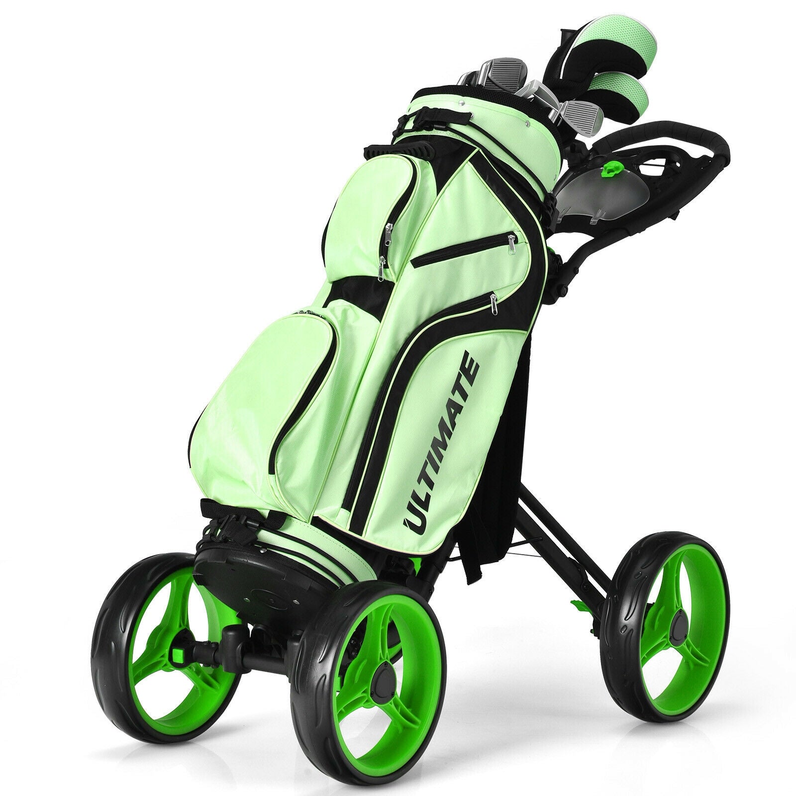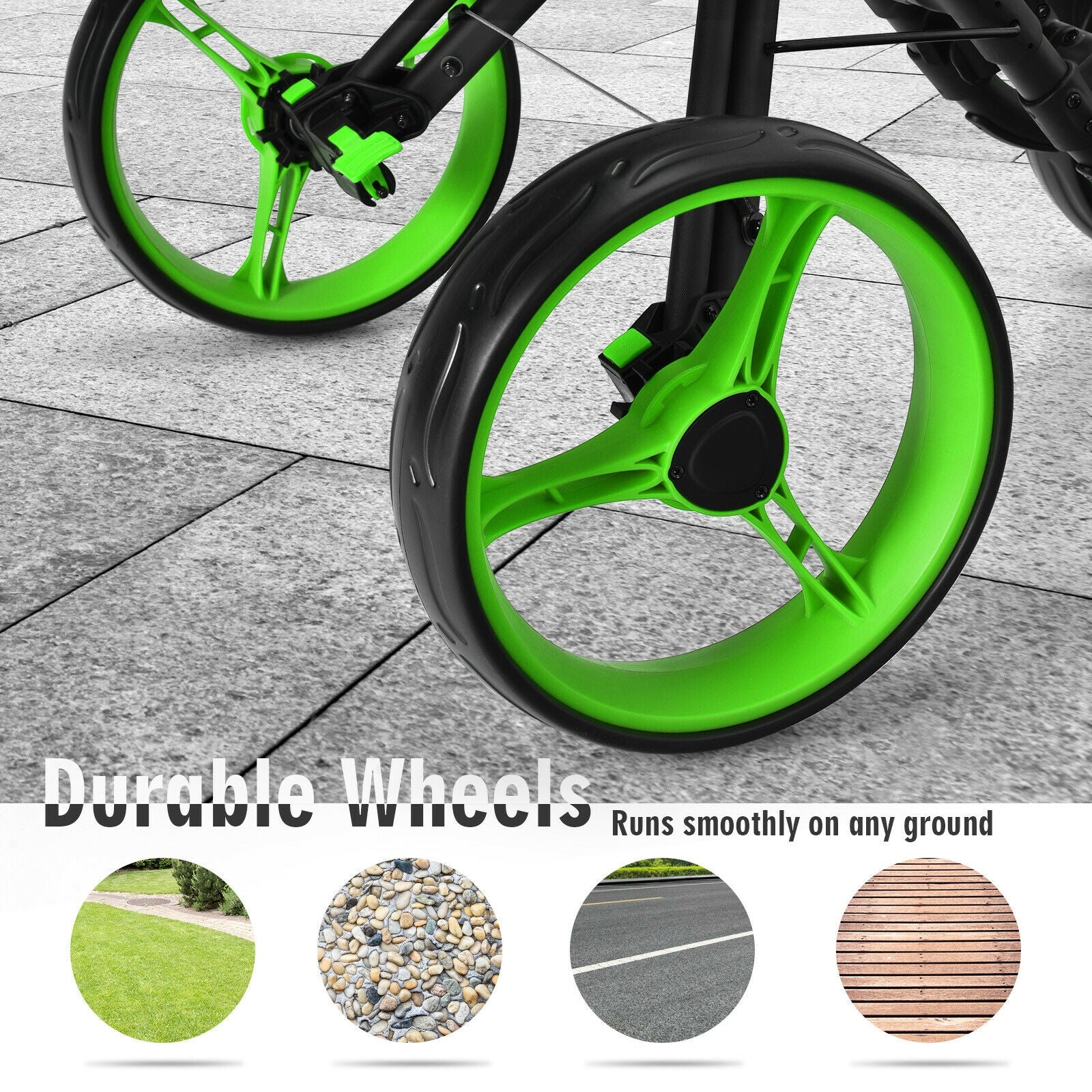 ● Sturdy aluminum construction with a high load-bearing capacity● Wear-resistant EVA wheels with shock absorption● Upper & lower brackets w/ elastic strap could fix any size of golf bag● Big φ11.4” rear and φ10.4” front wheels with anti-slip texture● Adjustable handles suit different heights of different people● The quick brake mechanism make it stop firmly without sliding● Foldable design makes it very easy to store and carry● Adjustable umbrella holder always keep users from harmful rays● A waterproof storage bag holds all your items safely● Comes with a scoreboard for you to keep all game necessaries● A waterproof storage bag and a cup holder included is perfect for users● Rubber wrapped handle for an ergonomic grip