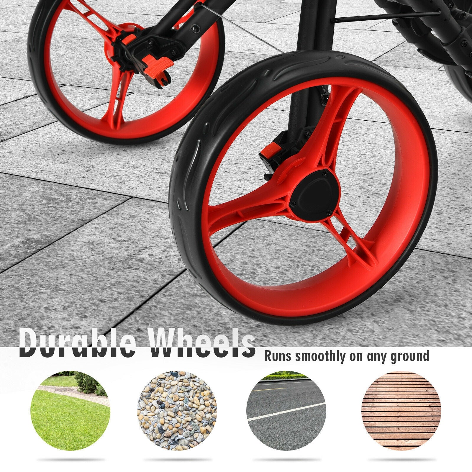 ● Sturdy aluminum construction with a high load-bearing capacity● Wear-resistant EVA wheels with shock absorption● Upper & lower brackets w/ elastic strap could fix any size of golf bag● Big φ11.4” rear and φ10.4” front wheels with anti-slip texture● Adjustable handles suit different heights of different people● The quick brake mechanism make it stop firmly without sliding● Foldable design makes it very easy to store and carry● Adjustable umbrella holder always keep users from harmful rays● A waterproof storage bag holds all your items safely● Comes with a scoreboard for you to keep all game necessaries● A waterproof storage bag and a cup holder included is perfect for users● Rubber wrapped handle for an ergonomic grip