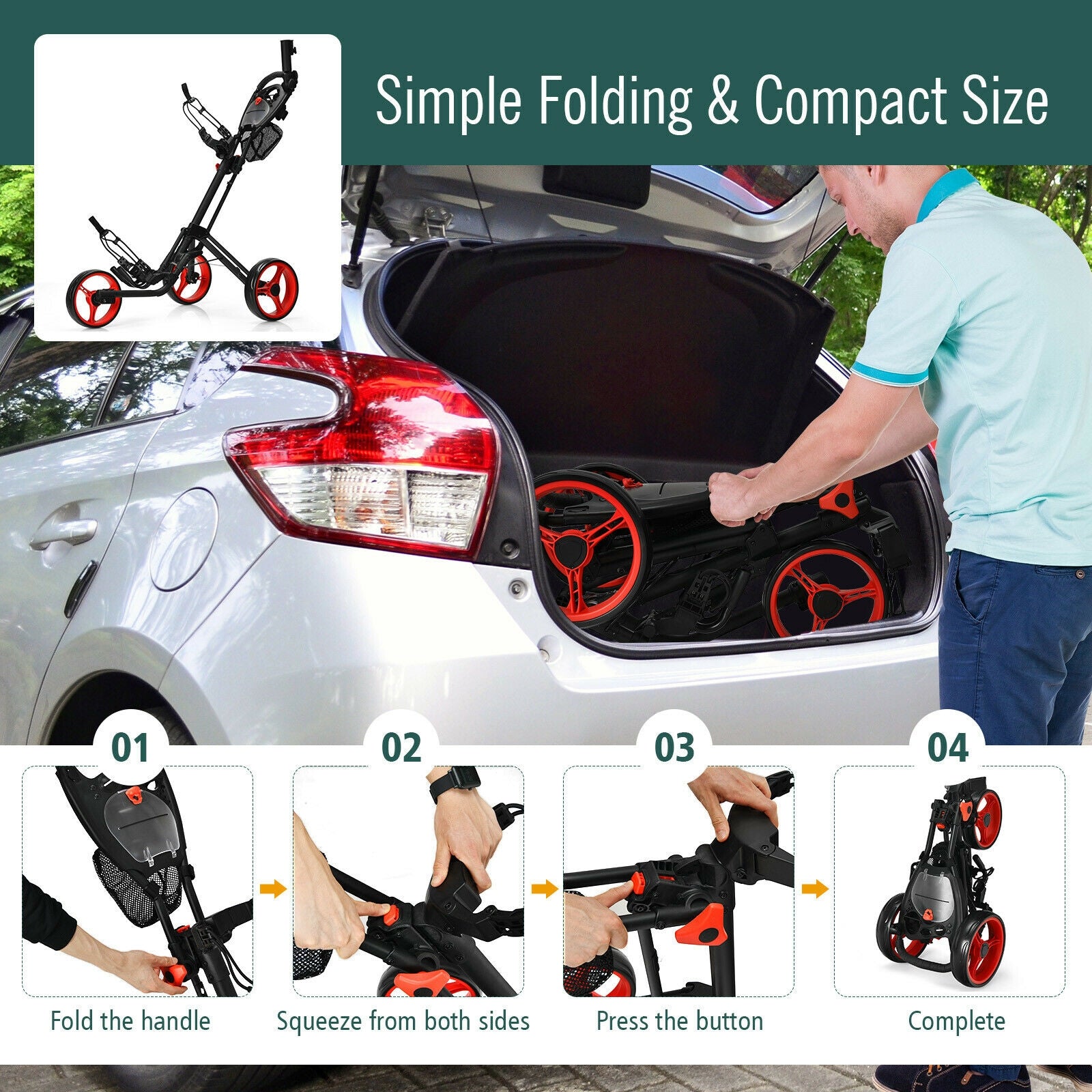 Folding 3 Wheels Golf Push Cart with Brake Scoreboard Adjustable Handle-Red
