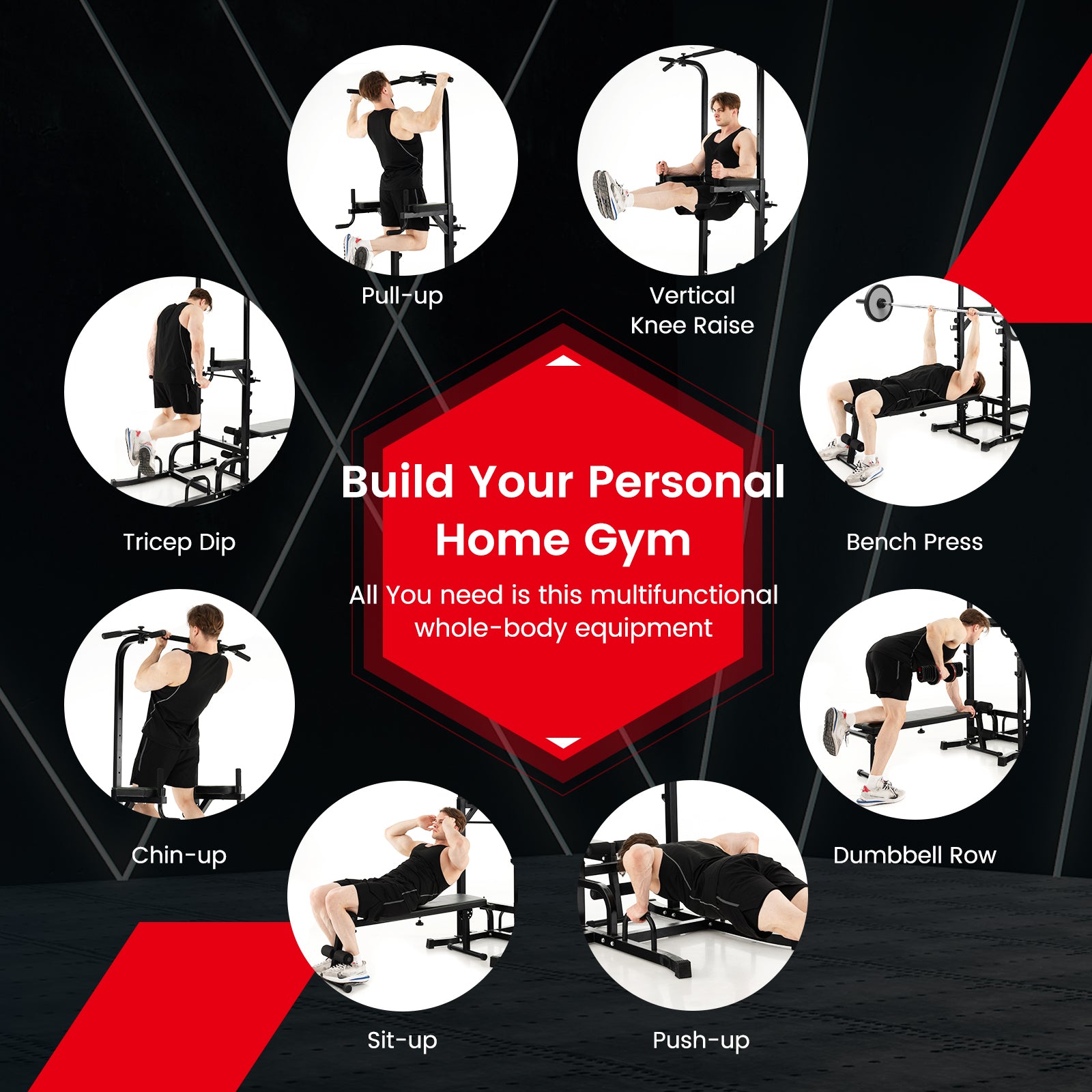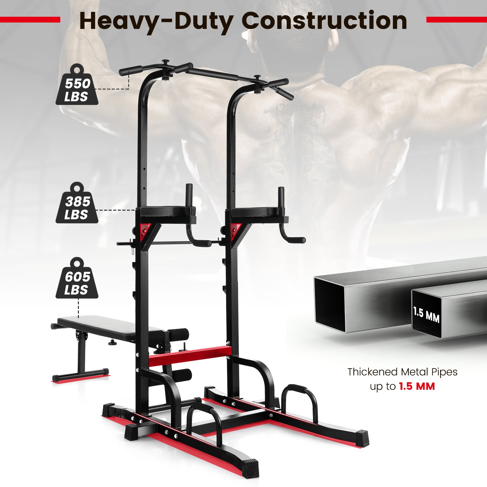Power Tower Pull Up Bar Stand with Adjustable Heights and Bench
