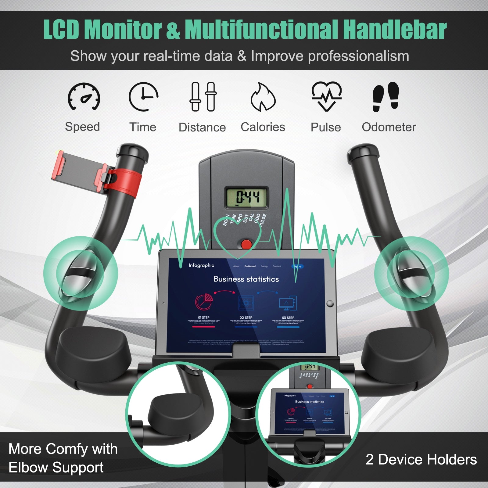 ● Including 1 x Exercise Bike ( Need 2x AA battery,not included) 1 x Instruction ● Heavy-duty steel frame can support up to 287lbs ● The adjustable resistance knob allows you to change the training intensity as needed ● You can press the resistance button for emergency brake ● There are 2 adjustable non-slip feet on the bottom of the bike ● The LCD monitor helps you know your training progress better ● 2 device holders allow you to enjoy music and videos during training ● 2 front wheels make it convenient for you to move the exercise bike ● The aluminium alloy foot pedals can be adjusted to fit your foot size ● The belt driven system provides a smooth and quiet ride experience ● The height of the seat and handlebar can be adjusted to meet your needs ● Easy to assemble with detailed instructions