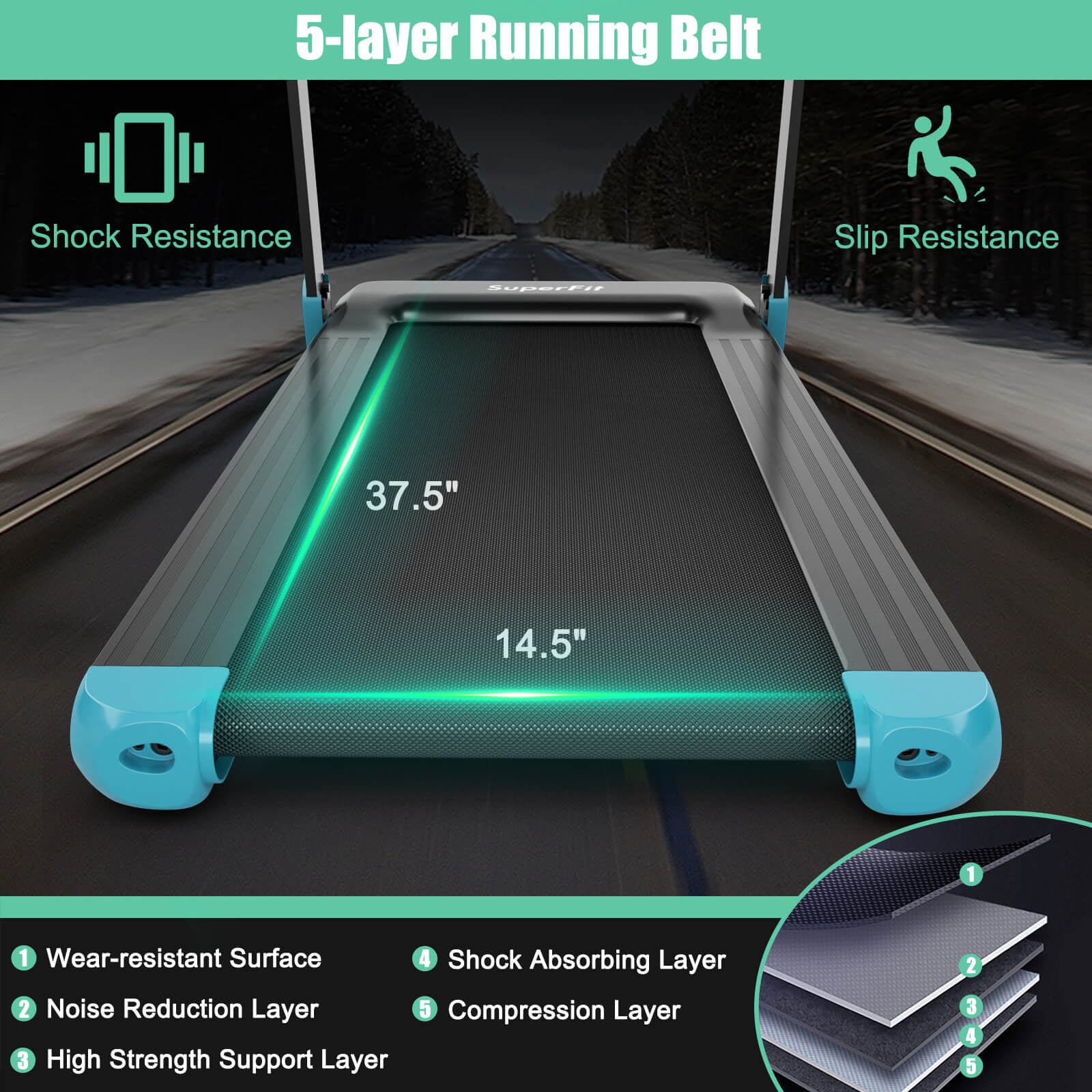 ● LED display for feedback data of time speed distance calorie and heart rate directly● GYMAX APP connection for controlling treadmill recording workout data and competing with others etc● Offers comfy running experience with 5-layer running belt● Protects your legs because of its shockproof and anti-slip running surface● 0.6 - 7.5 MPH adjustable speed for walking jogging and running● Achieve your sports goals effectively with 12 preset programs and 3 modes● Prevents disturbing others while running thanks to its powerful and quiet motor● Bluetooth speaker and device holder for interesting workout● Foldable design and 2 built-in wheels for easy storage and movement● Speed unit could be switched between mile and km in APP● Please do not place the treadmill on carpet during usage to avoid motor overheat