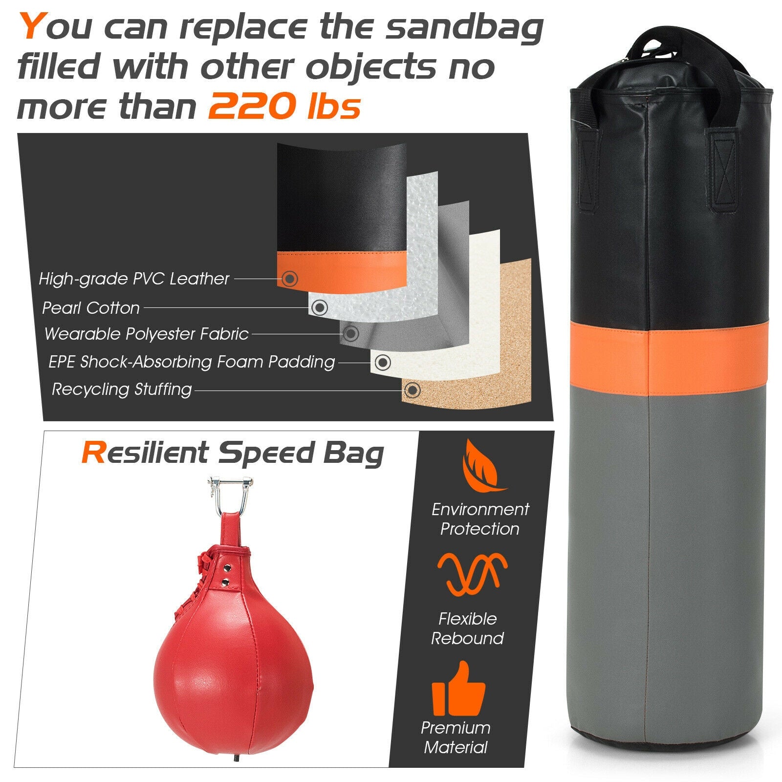 ● The product will be delivered in two packages separately● Multi-function boxing stand with a heavy bag and speed bag for two exercise methods● Adjustable speed bag height fits people of different heights and needs● Constructed of a sturdy steel frame to ensure long-lasting use● Y-shaped base with anti-slip rubber pads features great stability● The multi-layer heavy bag is durable and sweat-proof● Suitable for home gym exercise and strength training● Easy to assemble with clear instructions and heavy bags can be replaced