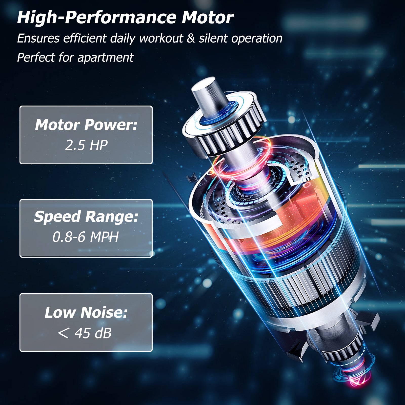 ● 2.5HP motor for powerful yet quiet performance● 0.8-6 MPH for walking jogging and running● Exercise without disturbing others thanks to the <45dB operation● Absorb impact and reduce stress on your joints with shock absorbers● The 7-layer anti-slip diamond running belt ensures a secure and stable surface● Designed with long and wide running belt for a comfy workout exercise● Stay motivated with the clear LED display● Track your time distance speed and calories burned● Included remote control for great convenience● Suit your individual needs for customized workouts with 15 preset programs● 2 smooth wheels and 5 inches height for easy transportation and storage● Add a touch of elegance to any space thanks to the natural rubber wood