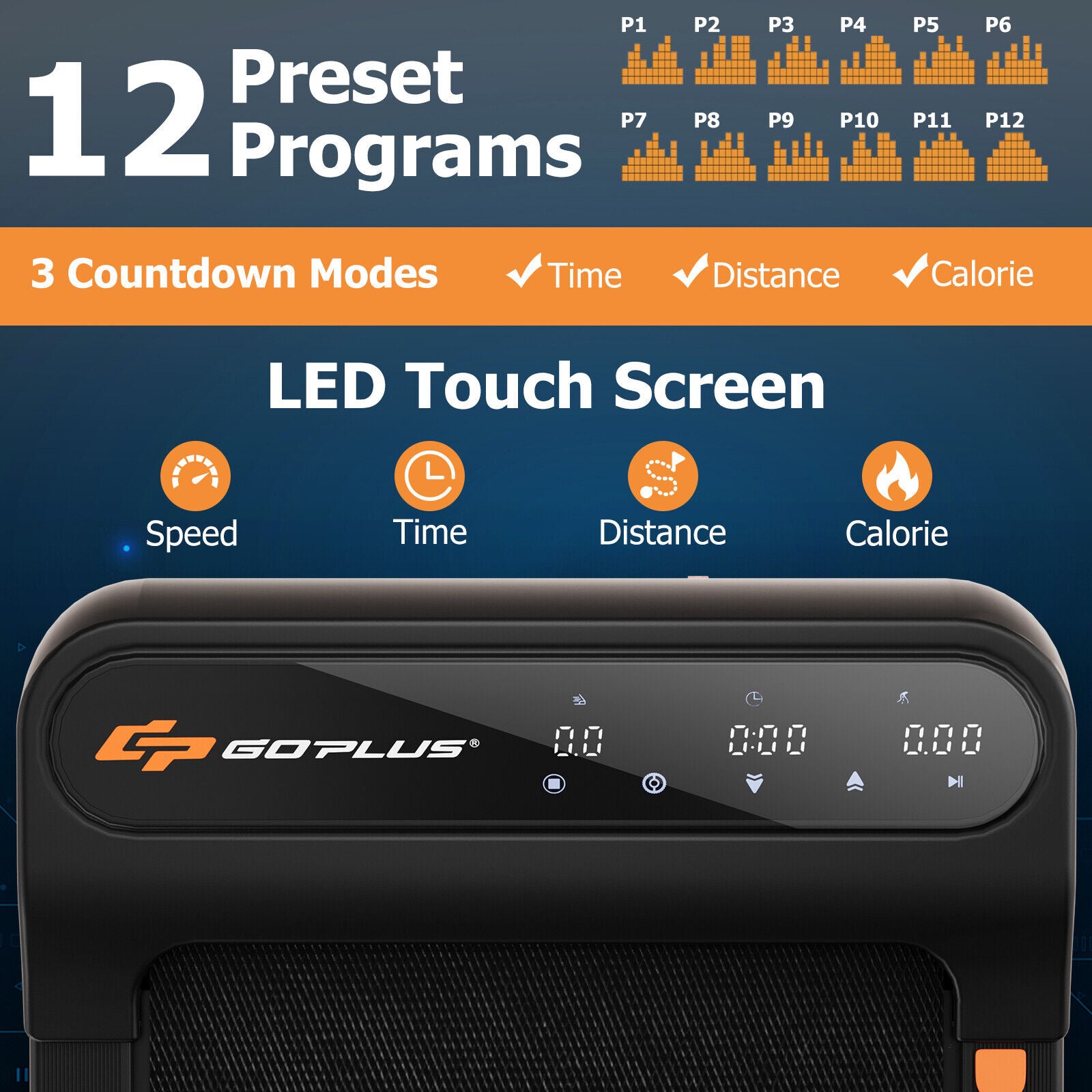 ● Provide safety and comfort with 7-layer running belt● Reduce impact on joints and muscles thanks to the 14 shock absorbers● Track the data of speed time distance and calorie through LED touch screen● Make operation more convenient with watch-like remote control● Press the pause button to keep data all the time for the water break● Cater to different fitness goals with 12 preset programs and 3 countdown modes● 2-in-1 design: walking mode (0.5-2 MPH) and jogging mode (2-4 MPH)● Deliver consistent performance and smooth operation with 2.25HP motor● Ensure a quiet and uninterrupted workout experience with less than 50dB operation● Accommodate most individuals with 265 lbs weight capacity● Start walking or jogging right away thanks to the installation-free design● 2 smooth wheels for hassle-free movement● Easy to store with 5 inches thickness