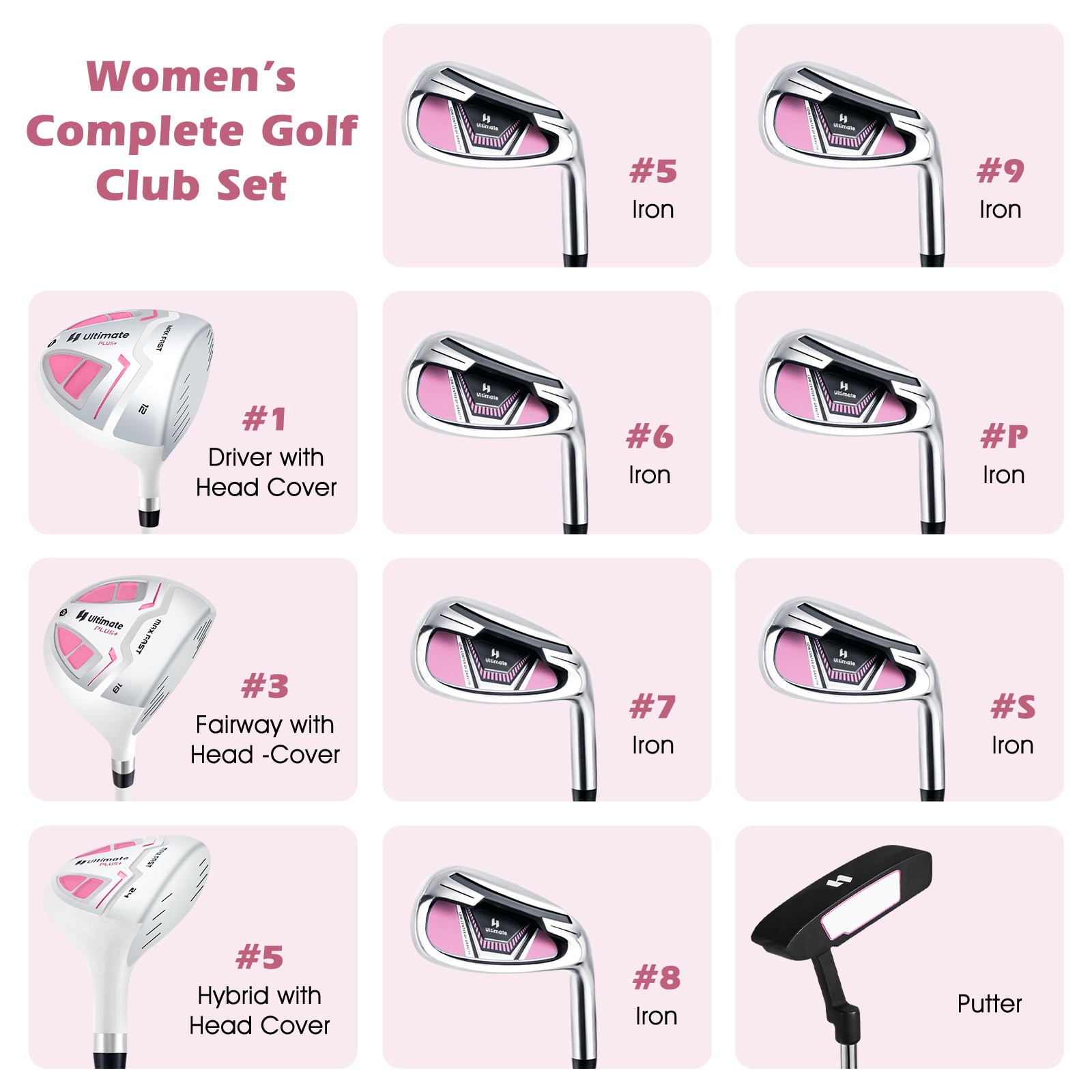 ● 14-way top organizer protect your clubs from scratching● Multiple pockets including waterproof valuable pocket and full-length apparel pocket● Allows you to enjoy cold drinks on the course with an insulated cooler bag● Equipped with a glove holder as well as a towel ring● 2 holders ensure more secure fixation of the umbrella● Comes with a zippered rain hood to protect the clubs from water● Reduces pressure on shoulder with padded shoulder strap● Easy carrying with top integrated handle soft non-slip handle and bottom handle● Fits more terrains with auto pop out legs● Includes driver fairway hybrid #5 #6 #7 #8 #9 #P #S irons and a putter● Putter made with visual alignment to increase accuracy● Ultra lightweight and easy to control with graphite shafts● TPR grips with non-slip texture bring more confidence with each stroke