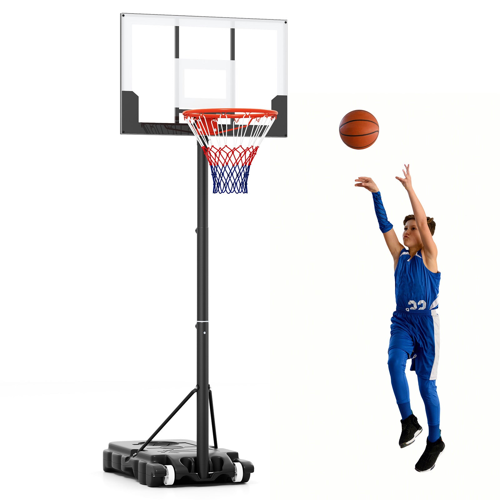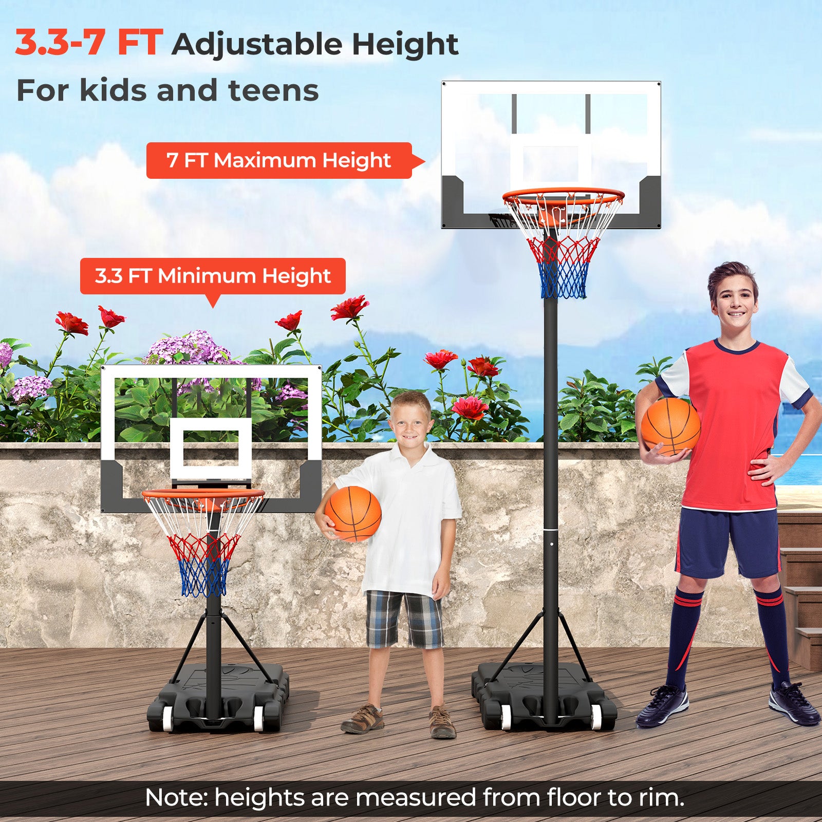 ● 3.3-7 ft adjustable heights cater to different ages and levels● Easy height adjustment with no tools required● Equipped with a shatterproof PC backboard● Enhanced impact resistance with backboard metal support frame● Can add sand or water into the base for added stability● Can be place the basketball on the base when not in use● Effortless to move around with built-in wheels● Thick metal tubes improve stability and durability● Uses a stable triangular structure to connect the main pole and base● Suitable for various indoor and outdoor places● Complies with ASTM and CPSIA