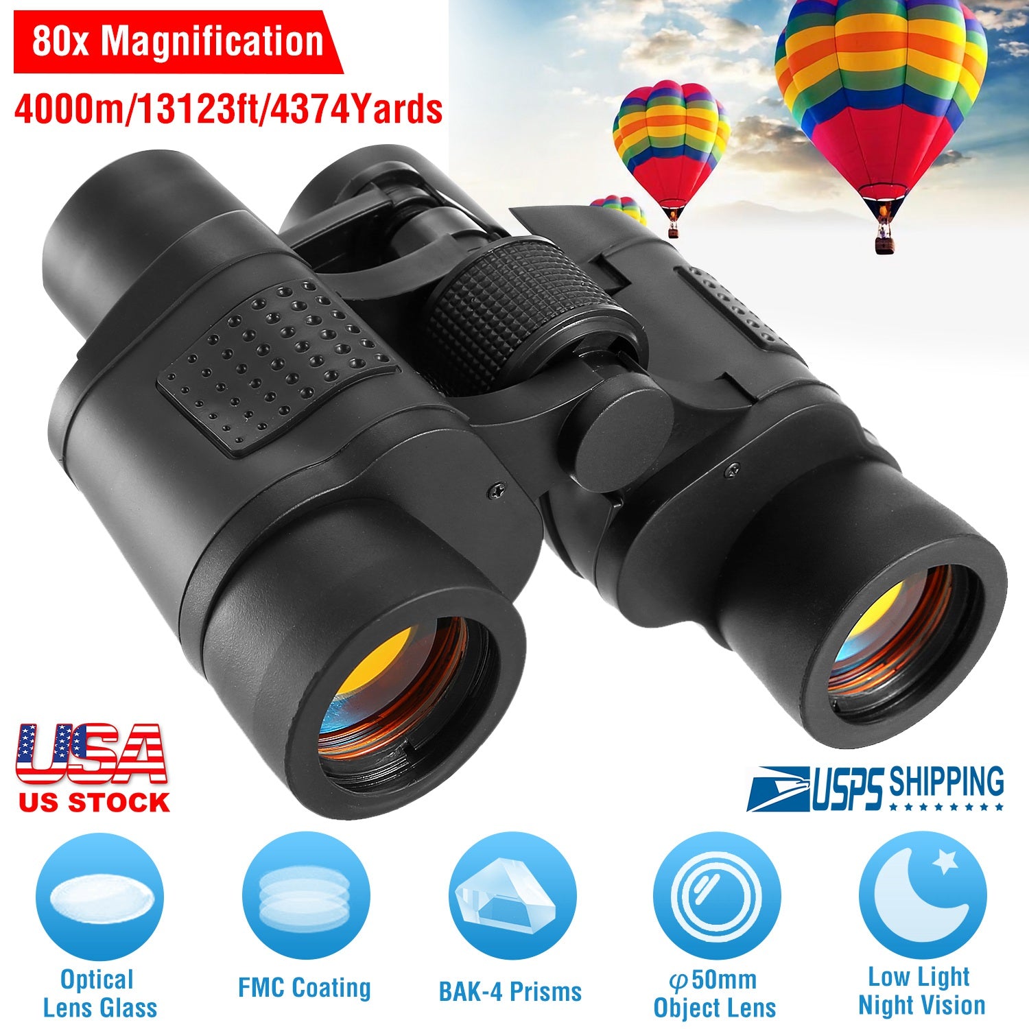 Bring the world closer and enjoy a detailed view with our powerful binocular. It features 80x magnifications, 50mm-diameter object lens, 18mm-diameter eye lens, low light night vision and compact portable size. When you observe some objects, it will bring object 80times closer and allows more lights to come through, much more clear details, even at low light condition. In addition, it adopts multi-layer-coated aspherical lenses elements for light reflection and minimal distortion, better image brightness, contrast and quality. With a large field of view (13123ft/4374Yards), it is optimal for watching fast-moving things. Built with a rugged exterior for durable use, and comes with a carrying case and strap makes it easy for carrying.