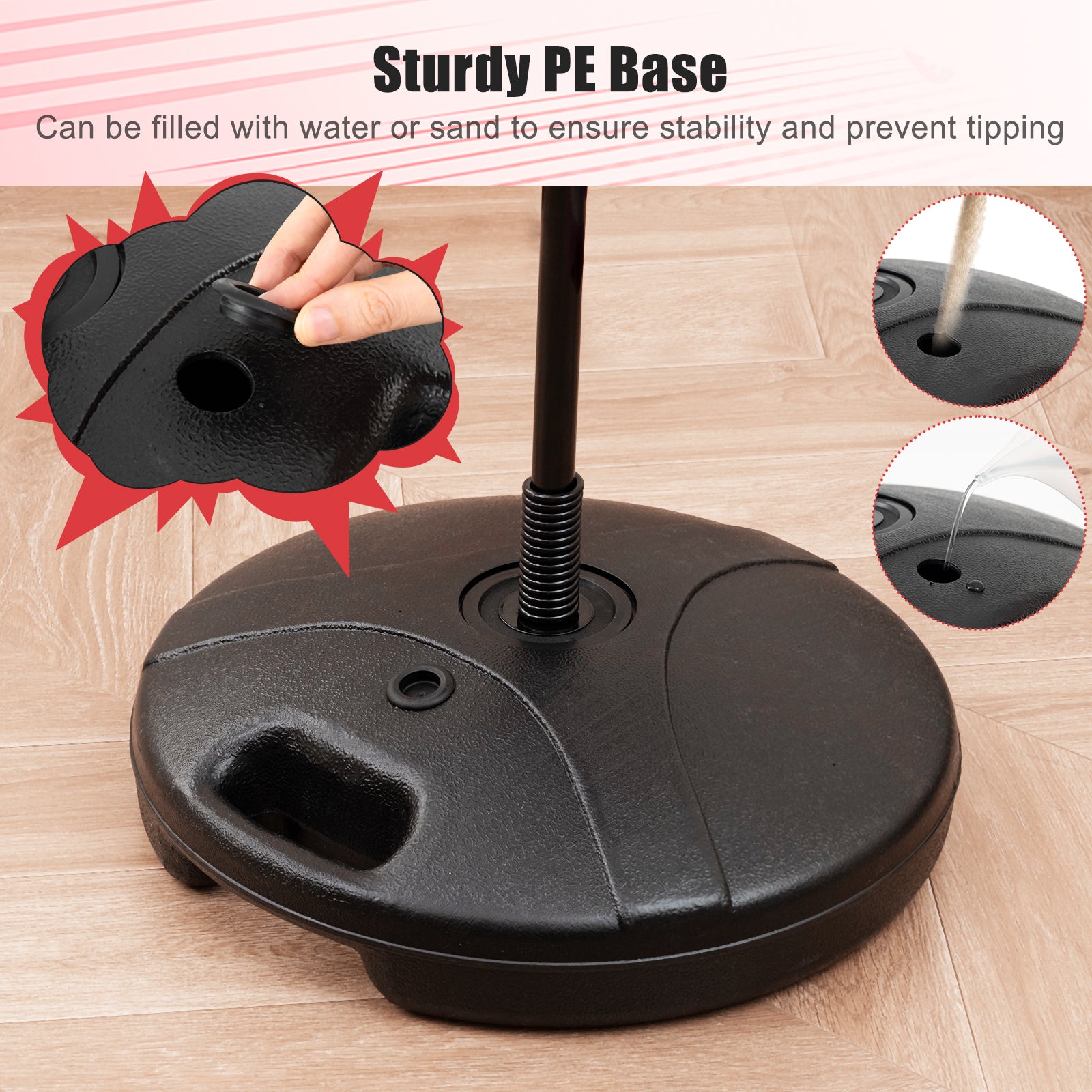 ● Suitable for kids over 3 accompany your little one growing up● Premium PVC leather is tear-resistant wear-resistant and waterproof● Stable metal frame minimizes the risk of toppling over● Strong high elastic spring ensures quick rebound from any angle● The base can be filled with water or sand to ensure stability and prevent tipping● Soft padded boxing gloves with hook and loop fasteners protect kids hands ● The gloves can be hung on the pole for easy storage ● Engages children in physical activity promoting fitness coordination and well-being● Quick and straightforward setup process that allows for simple use● A built-in handle makes it easy to carry the base